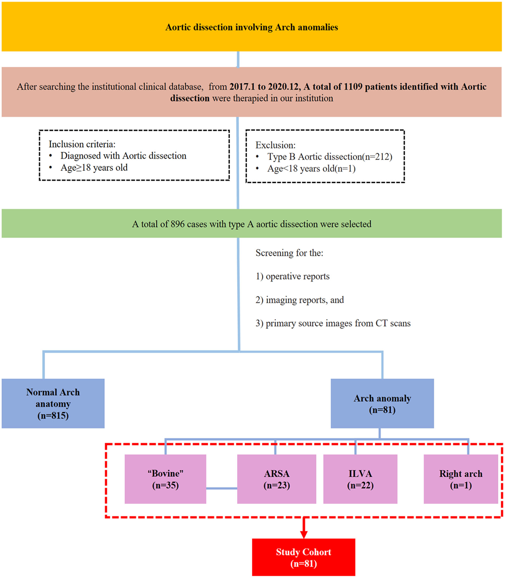 A total of 896 patients with type A aortic dissection were treated in our center from January 2016 to December 2020. After screening the CT reports and surgical records, 81 patients with arch anomalies were included in this study; 35 had “bovine” anomaly, 23 had an ARSA, 22 had an ILVA, and right-sided arch combined with an ALSA was found in one case (Figure 1).