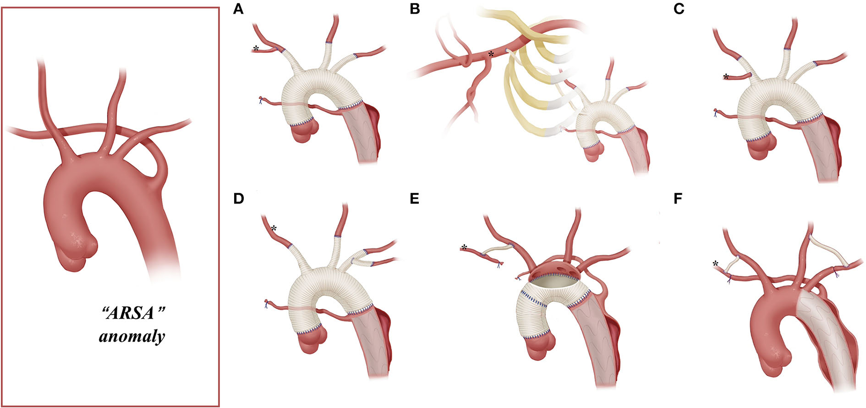Arch technique for ARSA in patients with type A aortic dissection. *Distal ARSA; (A) stage TAR for ARSA; (B) extra-anatomy revascularization of the right axillary artery; (C) ARSA connected to the vascular graft of the RCCA; (D) ARSA directly anastomosed to the 8-mm arch branch of the four-branched graft; (E)en bloc technique for the ARSA; (F) hybrid technique for ARSA.