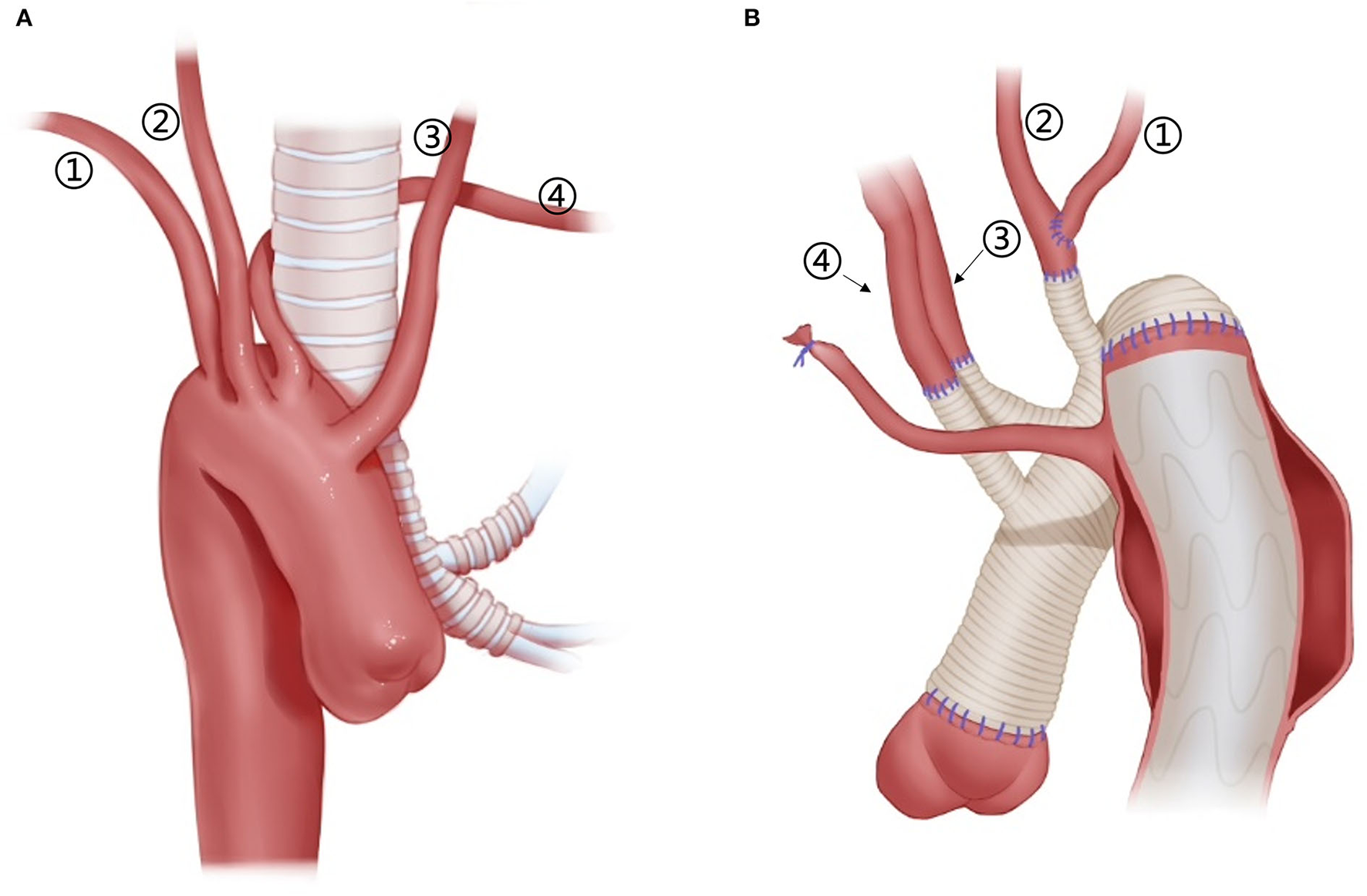 Arch technique for patients with right arch and ALSA. (1) RSA; (2) RCCA; (3) LCCA; (4) ALSA. (A) Schematic diagram of the anatomy of the right arch + ALSA, from the front view. (B) Arch technique for a patient with right arch + ALSA, from the posterior view. ALSA, from the posterior view.
