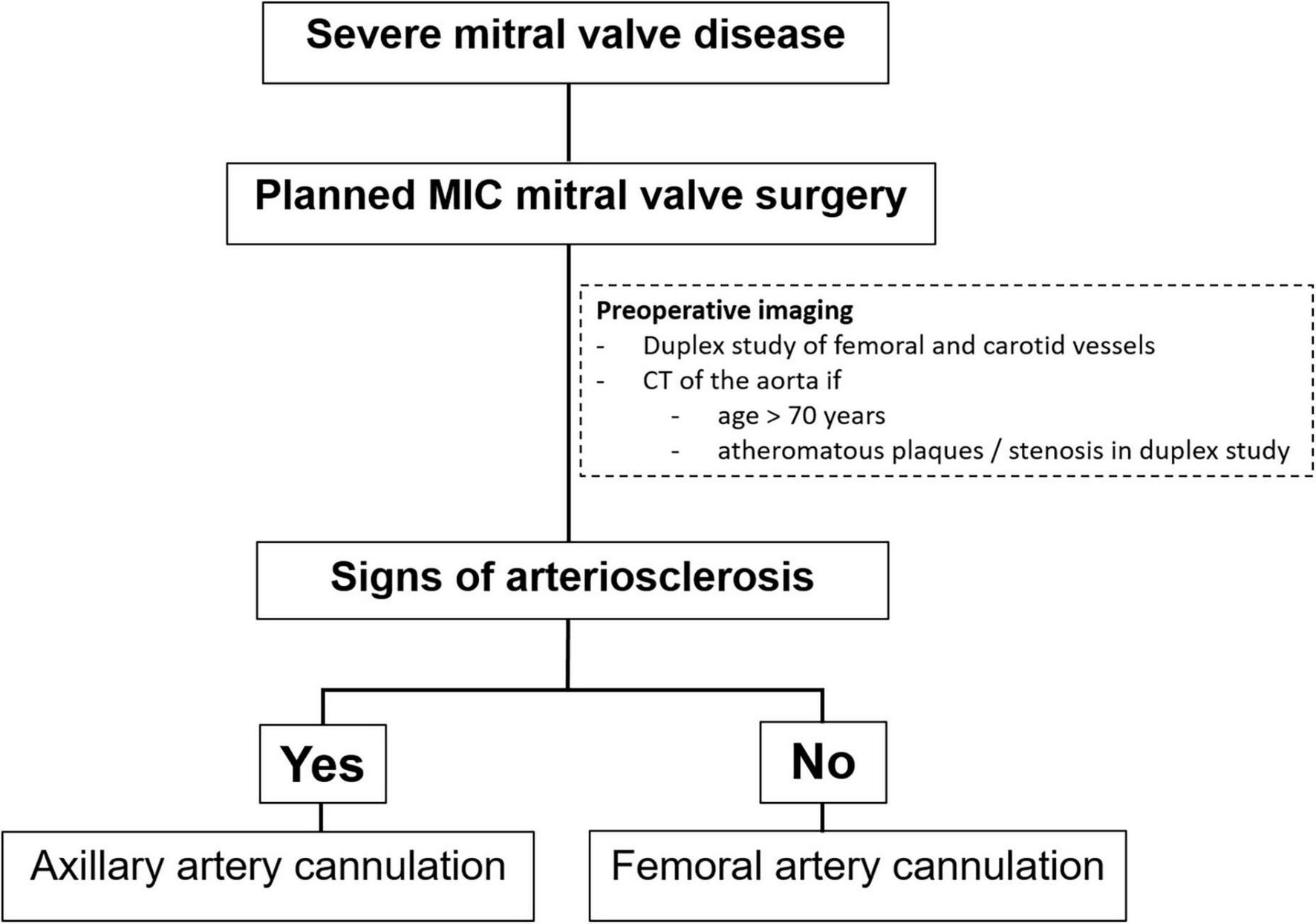 In summary, the burden of arteriosclerosis is an important factor to consider before MIS MV surgery. Preoperative CT screening for aortic atherosclerosis seems to be reasonable in patients age >70 years and in those with signs of generalized atherosclerotic disease. Selective use of antegrade axillary artery perfusion in patients with systemic atherosclerosis shows similar in-hospital outcomes as compared to lower risk patients undergoing retrograde femoral perfusion. Patients with higher perioperative risk and severe atherosclerosis can be safely treated via the minimally invasive approach with antegrade axillary perfusion.