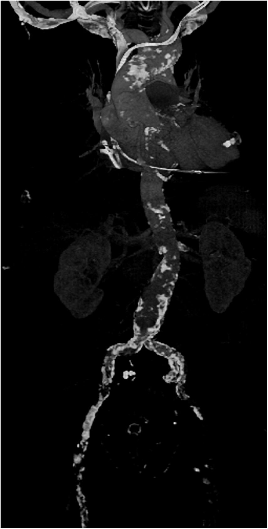 Example of a computed tomography (CT) scan of the aorta of a patient with severe arteriosclerosis in the axillary artery, aortic arch abdominal aorta and especially the femoral vessels in which minimally-invasive surgery was performed by using an antegrade arterial perfusion via arteria axillaris.