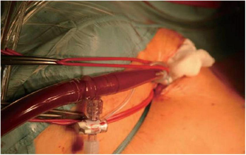 The procedural steps of axillary artery cannulation are outlined in Supplementary Video 1. Following a 3 cm infraclavicular incision, the axillary artery is identified. After placement of cannlation sutures, direct puncture of the axillary artery is performed using Seldinger’s technique. Echocardiographic visualization of the wire is crucial to avoid vascular injury. After placing the dilatator over the wire, a 5–8 mm incision of the axillary artery is performed. Afterward, the arterial cannula is carefully placed 1.5–2 cm into the vessel avoiding any resistance. Depending of the size of the axillary artery, we use a 18 Fr. or 20 Fr. short-tip Medtronic cannula. After fixation of the cannula, another stay suture is placed at the skin level to prevent dislocation of the cannula during cardiopulmonary bypass (CPB) perfusion.