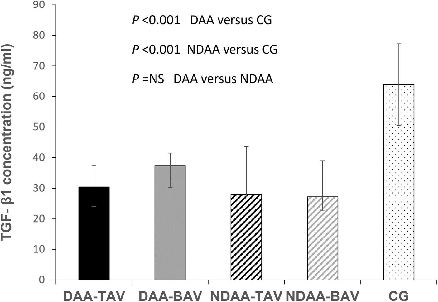 TGF-β1 concentrations in patients with dilated and non-dilated aortas according to aortic valve cuspidity. CG, control group; DAA-TAV, dilated ascending aorta- tricuspid aortic valve; DAA-BAV, dilated ascending aorta- bicuspid aortic valve; NDAA-TAV, non-dilated ascending aorta-tricuspid aortic valve; NDAA-BAV, non-dilated ascending aorta-bicuspid aortic valve.
