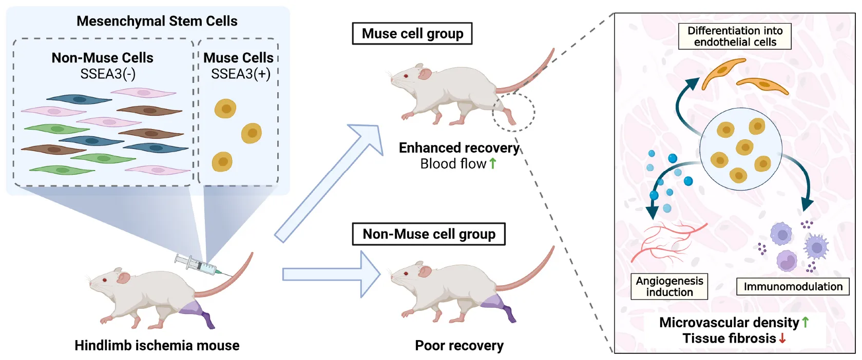 Intravenously administered human-Muse cells homed to mouse ischemic limb and delivered pleiotropic effects, including differentiation into vascular cells, neovascularization, and anti-fibrosis/anti-inflammatory effects, leading to the successful recovery of blood flow without immunosuppressant. Muse cells may thus provide a novel approach for treating limb ischemia.