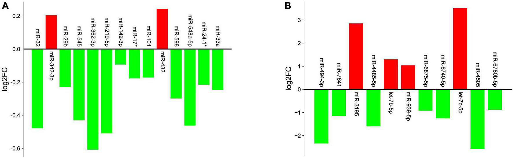 Graph illustrating the differential expression levels of miRs obtained from (A) GSE24591 dataset (B) GSE148153 dataset. X-axis represents the miRs and Y-axis represents logarithmic fold change (log2FC) of the miR expression levels. Red columns indicate upregulation; green columns indicate downregulation.