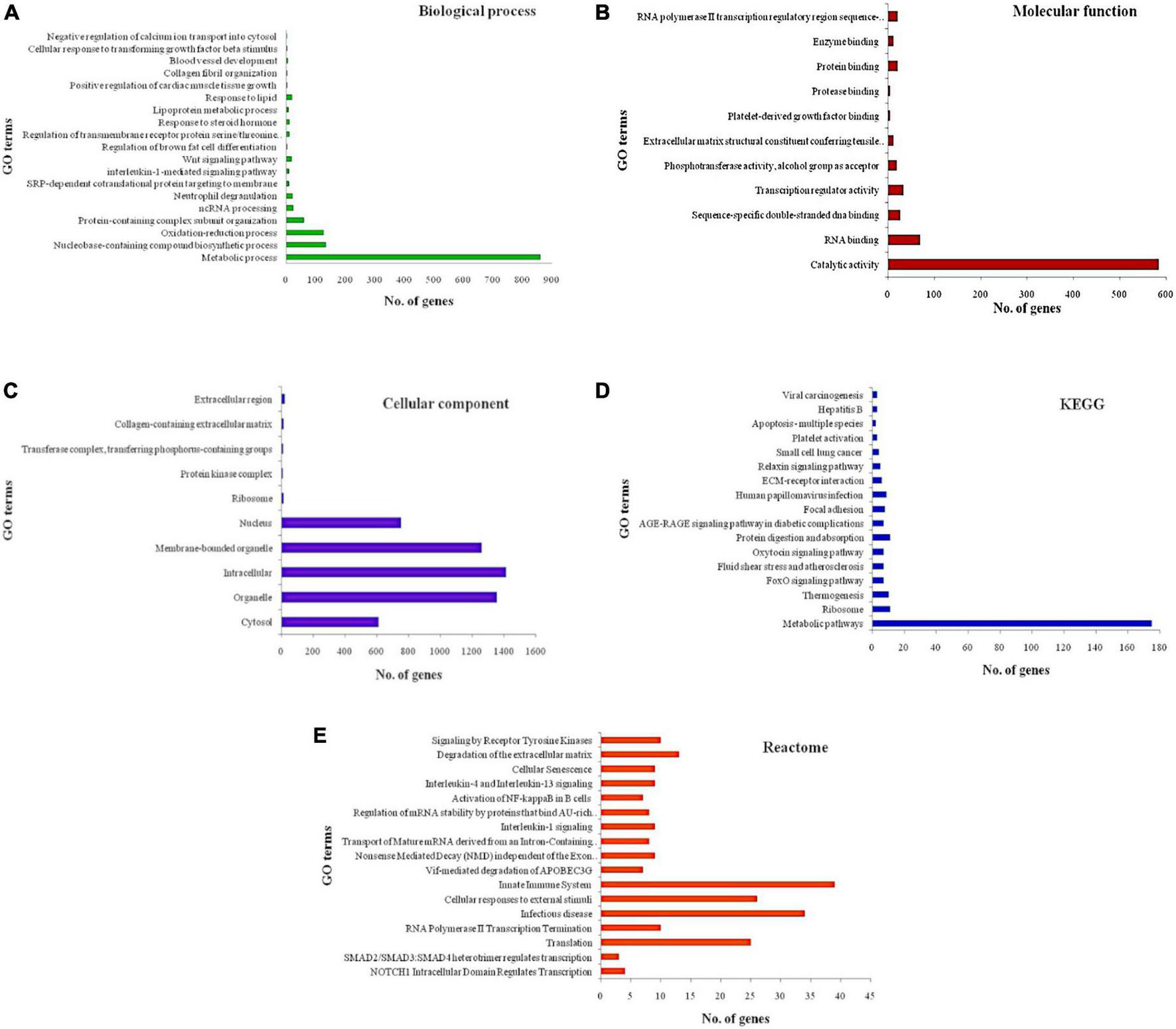 Significantly enriched gene ontology terms for the predicted targets (A) biological process (B) molecular function (C) cellular component (D) KEGG pathways (E) reactome pathways. X-axis represents the number of genes associated with each gene ontology (GO) term and Y-axis represents GO terms. Longest bar indicates the highest number of genes associated with the GO term and shortest bar indicates the least number of genes associated with the GO term.