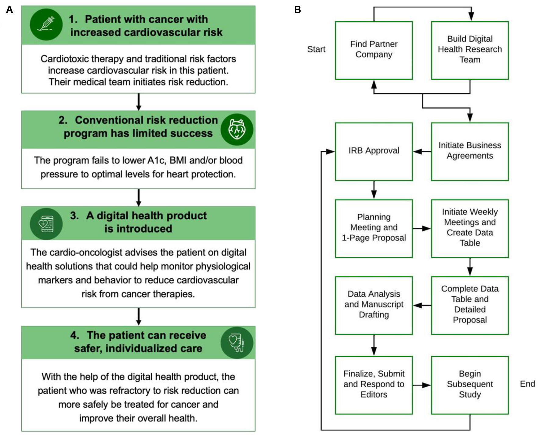(A) This figure shows how a cardio-oncologist could integrate a digital health product into risk reduction for a cancer patient. BMI: Body mass index. (B) This flow chart describes ten steps for building a digital health academic-industry collaboration. The process can begin with finding a partner company, building a digital health research team, or both concurrently. IRB: Institutional Review Board. Panel A was made with Infographia.