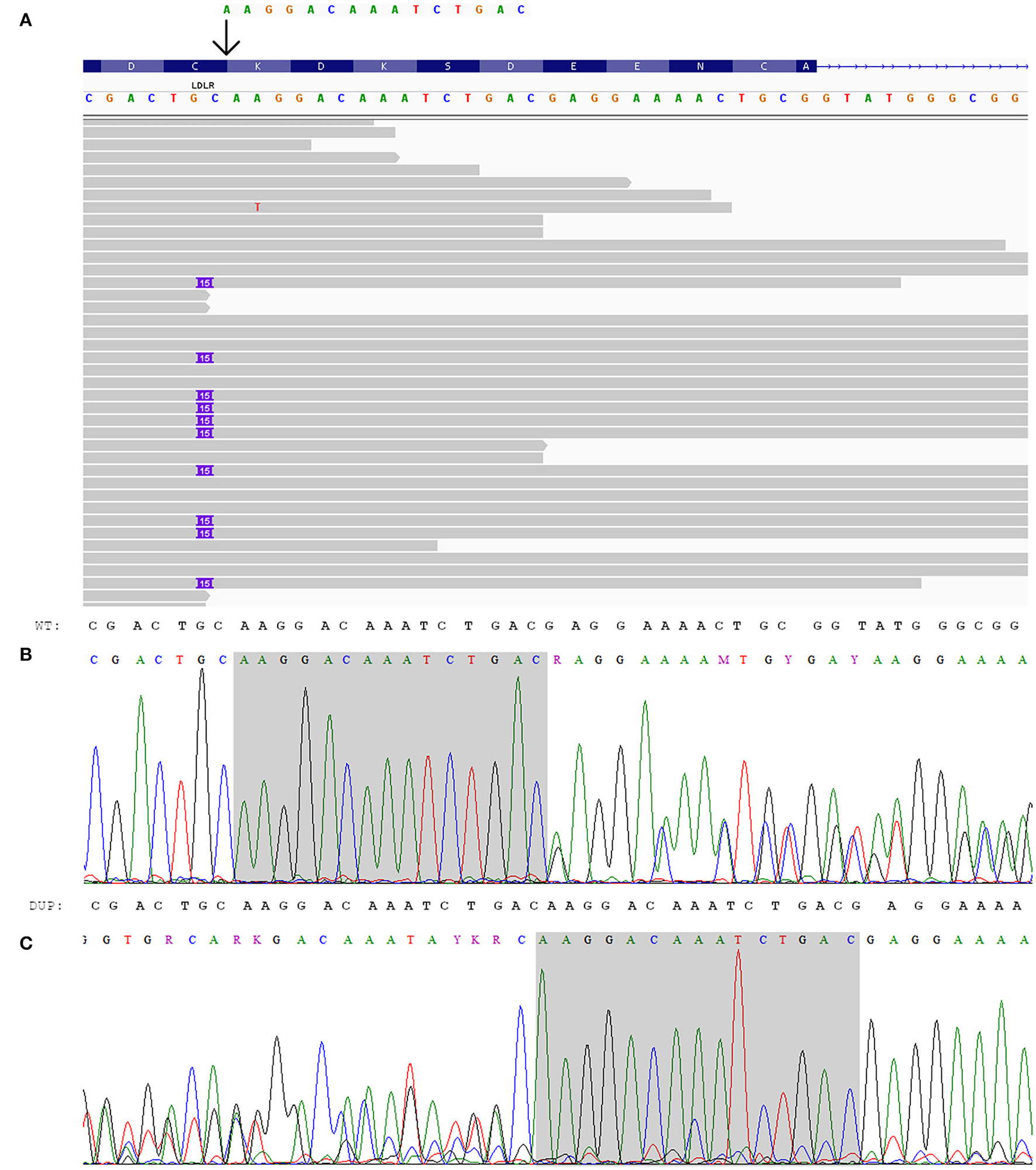 Genetic analysis of the index patient. (A) Integrated genome view of LDLR-p.K223_D227dup with IGV (12). (B, C) Electropherograms of LDLR-p.K223_D227dup: (B) sequence from the forward primer, (C) sequence from the reverse primer (reverse complement).