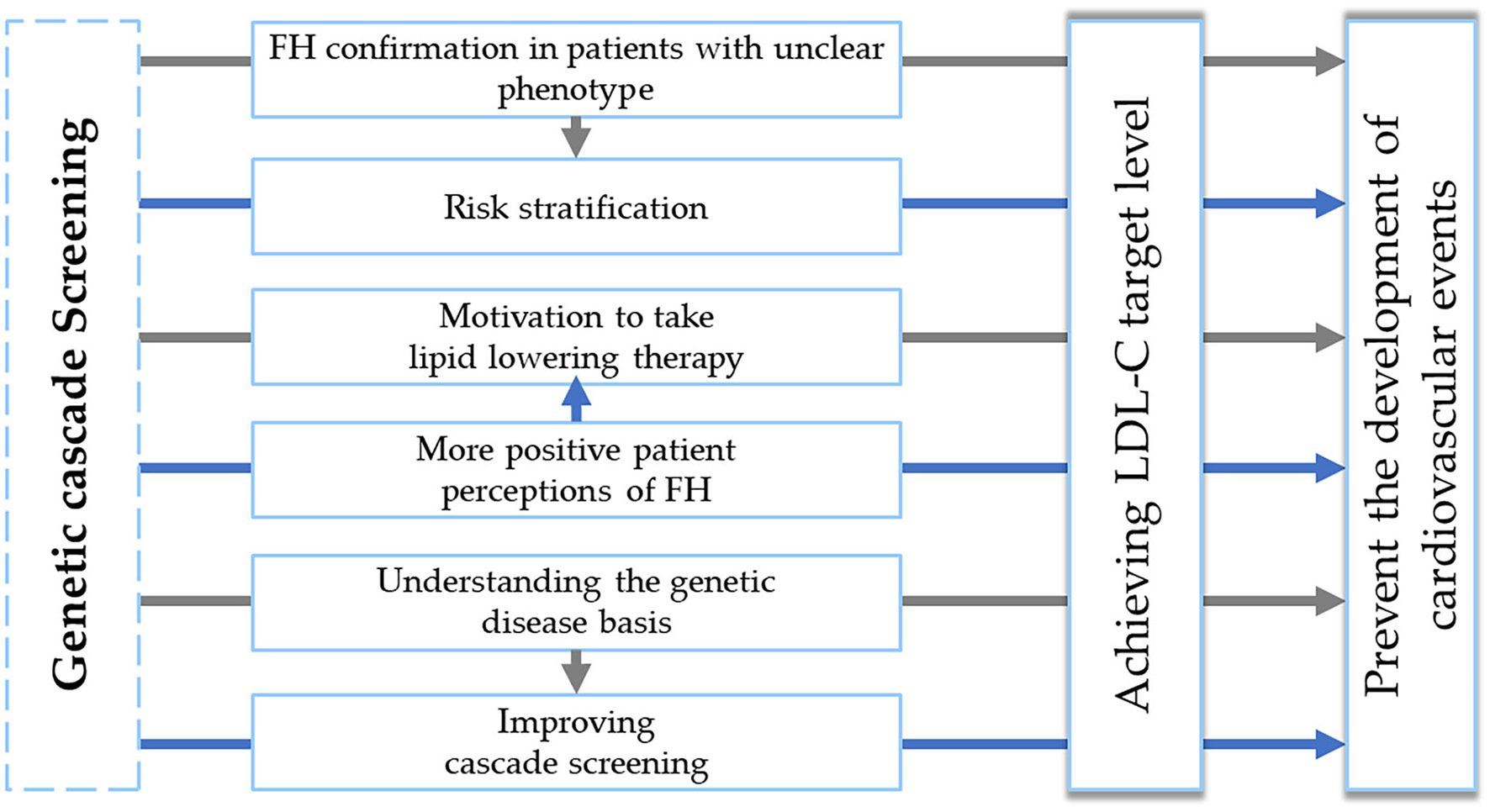 Genetic cascade screening benefits. FH, familial hypercholesterolemia. LDL-C, low-density lipoprotein cholesterol.