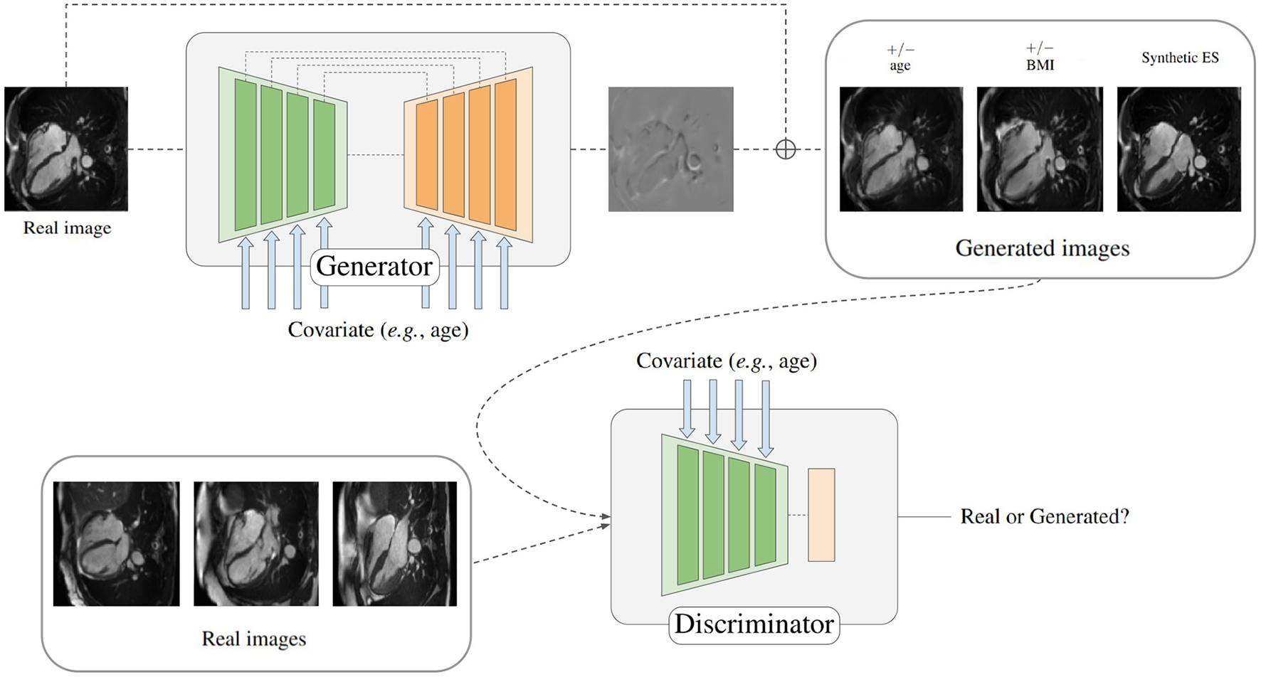In order to generate synthetic images of the heart depending on a given covariate, a conditional generative adversarial network is proposed, as depicted in Figure 1. The two components of the model are a generator and a discriminator. Specifically, the generator is responsible for creating the mapping that will be applied to the input image when conditioned on different covariates to obtain a target image, while the discriminator is trained to tell apart real and synthesized images given some covariates.
