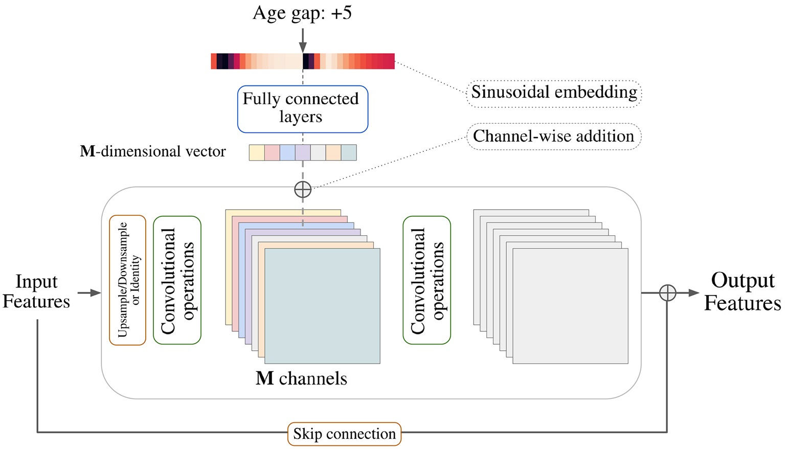 As covariates, age and body mass index (BMI) were considered for two separate tasks. The generator was conditioned with the difference between the age (respectively BMI) of the input image and the desired output age (respectively BMI). The discriminator, however, was conditioned on the actual age (respectively BMI) of the input image (real or synthesized). The covariate was specified to the model using the Transformer sinusoidal embedding (24).