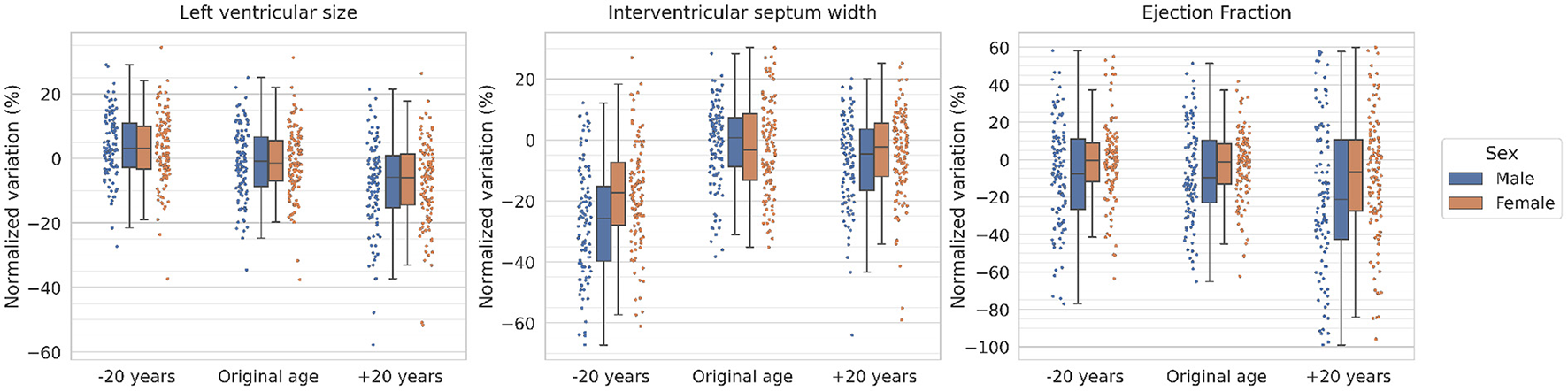 In order to quantify the specific changes performed in the heart, the LV size, the interventricular septum width and the ejection fraction are derived from automatically generated segmentations of the original and synthesized images (more details about the segmentation model are provided in Supplementary material). The normalized variation for these metrics after adding or subtracting 20 years to the original subjects is presented in Figure 4 separated by sex.