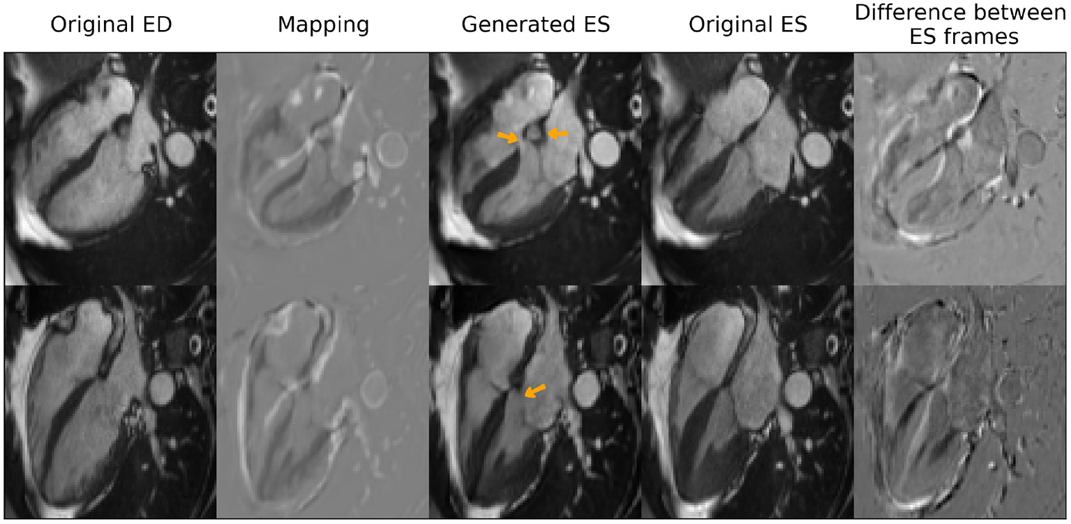 With regards to the transformation of cardiac time frames, the model obtained a root mean square error between generated images and the real ES frames of 0.06 (±0.01), when compared at the whole image level. Figure 5 shows some qualitative results obtained for this task that include the generated mapping and the pixel-wise absolute difference between the generated frames and the real ones. As observed in the figure, the model captured the thickening of the myocardium, the contraction of the right ventricle as well as the smaller changes in size in the atria between ED and ES. However, several hallucinations were also introduced (highlighted with orange arrows) by the model that are not clinically accurate.