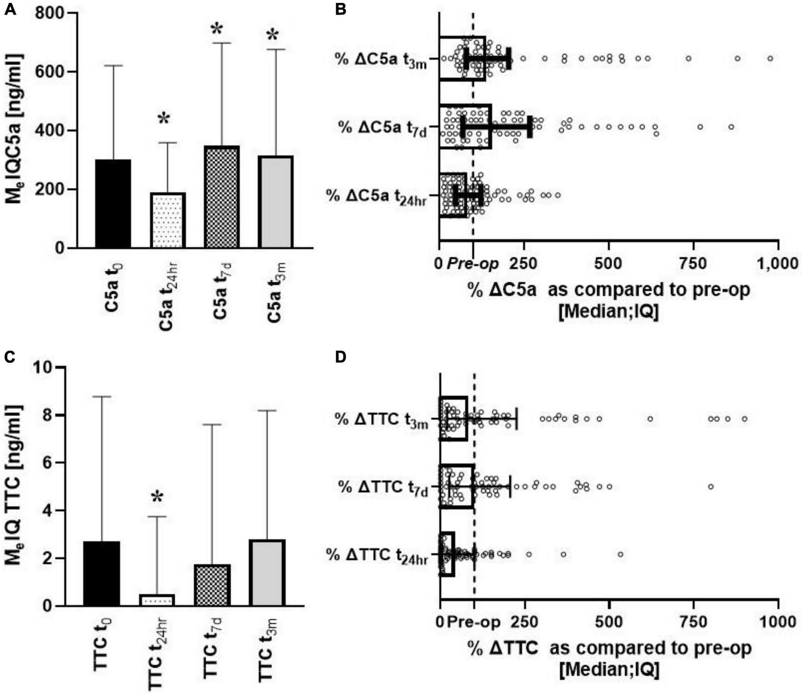 sC5a changed significantly over time with concentrations initially decreasing [U (85) =−3.17; p = 0.0015), rebounding to significantly higher values at 7 days [U (79) = 2.54; p = 0.011] and 3 months (U [69] = 3.34; p = 0.00082) (Figure 1A). When data were compared pairwise, the median changes from baseline were 83, 136, and 150% at t24h, t7d, and t3m, respectively (Figure 1B). sTTC levels changed significantly at t24h [U (63) =−4.31; p = 0.00016] followed by recovery to pre-surgical values (Figure 1C). When the data were compared pairwise, the median changes from baseline were 43, 101, and 83% at t24h, t7d, and t3m, respectively (Figure 1D). However, significant sTTC variability at tbaseline and t3m was apparent. The correlation between sTTC and C5a was present only at t24h (r2 = 0.37; p < 0.004) (data not shown). A regression analysis revealed that the level of sC5a was the most significant contributor to sTTC levels at t24h, accounting for 56% (p = 0.0067) and 26% (p = 0.041) of sTTC variance.