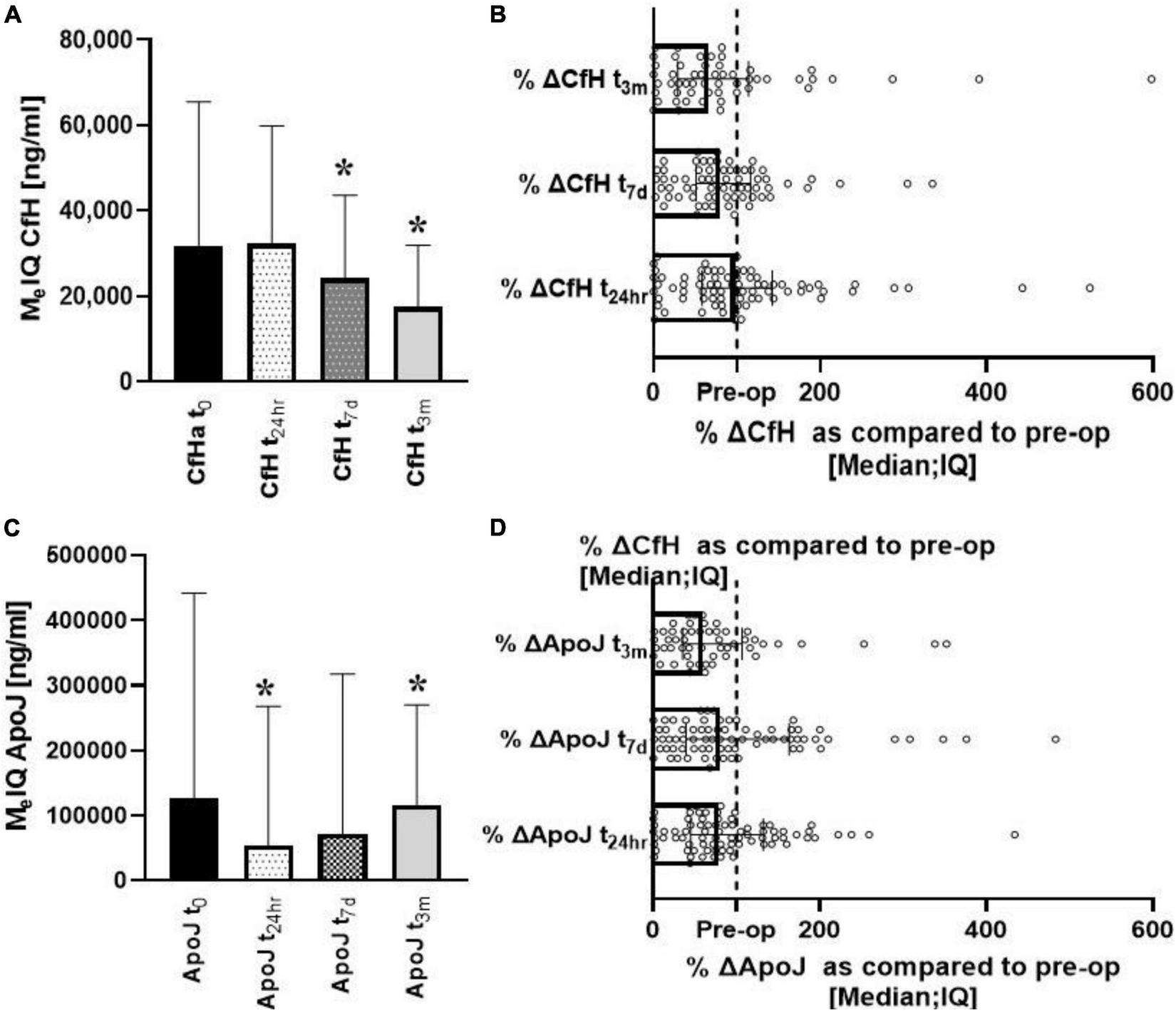 Longitudinal analysis of complement protective factors (CfH, ApoJ) after heart surgery. Progressive depletion of the CfH could be seen in the post-op period (A,B). In contrast, ApoJ started to recover after initial depletion (C,D). *Denotes the statistical significance of 0.05 or less.