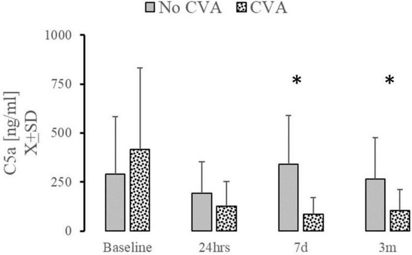 101 patients scheduled for non-emergent cardiac surgery donated blood before the procedure (tbaseline), and 24 h (t24h), 7 days (t7d) and 3 months (t3m) after. Complement activation was measured as a serum level of soluble activated component 5 (sC5a) and soluble terminal complement complex (sTCC). Simultaneously, protective complement factor H (CfH), and apolipoprotein J (ApoJ) were measured. Inflammatory responses were quantified using C-reactive protein (CRP) and interleukin-6 (IL-6). Details regarding anesthesia, intensive care unit (ICU) stay, pre-existing conditions, the incidence of postoperative complications, and mortality were collected from medical records.