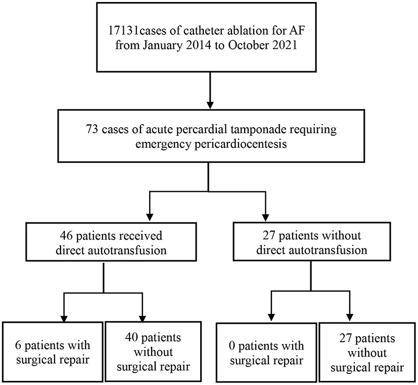 In the event of APT, emergency pericardiocentesis is necessary to stabilize hemodynamics and inhibit progressive shock (8). Once pericardial hemorrhage cannot stop, emergency surgical repair may be inevitable. Direct autotransfusion (DAT), a method of reinjecting aspirated pericardial blood directly back into the body via venous access without a cell-salvage system, may be easy to operate and can quickly stabilize hemodynamic status and buy time for anticoagulation reversal or cardiac surgical repair. Previous studies had reported cases of applying DAT to deal with APT during the perioperative period of AF-CA (9–13). However, despite the many potential advantages, DAT has not been conventionally adopted yet, due to the lack of consensus on security. Herein, our present study aims to further investigate the clinical feasibility and safety of DAT in the treatment of APT during AF-CA.