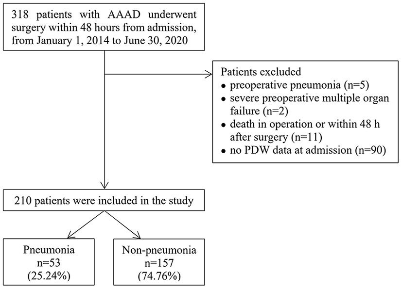 We identified 318 patients with AAAD who underwent surgery within 48 h of admission. One hundred and eight patients were excluded for the following reasons: preoperative pneumonia (n = 5); severe preoperative multiple organ failure (n = 2); death in operation or within 48 h after surgery (n = 11); no PDW data at admission (n = 90). Therefore, a total of 210 patients were enrolled in the final analysis (Figure 1), among which 25.24% (53/210) developed postoperative pneumonia.