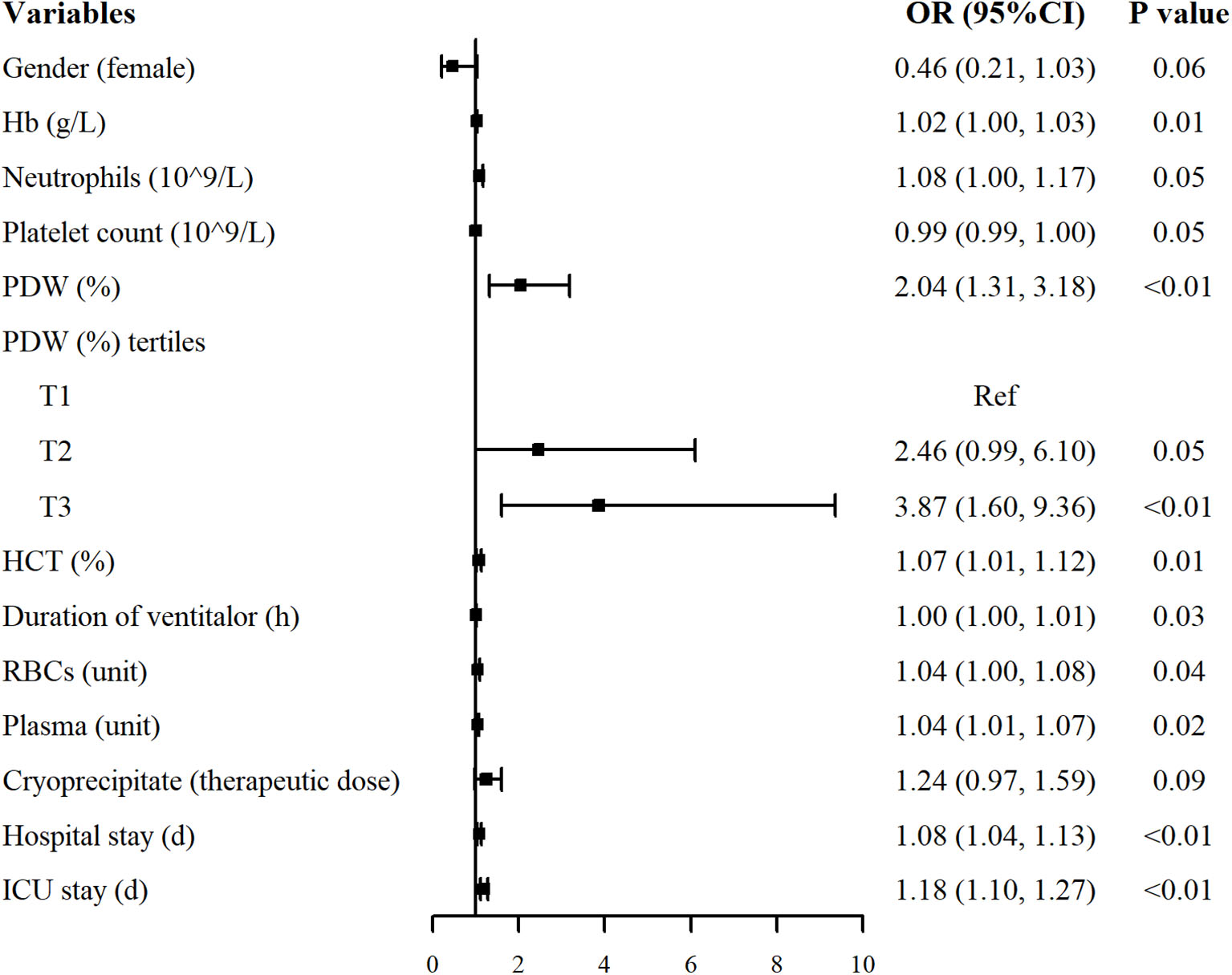 The results of the univariate analysis associated with the occurrence of postoperative pneumonia are shown in Figure 2. PDW and PDW tertiles were positively associated with the risk of postoperative pneumonia. Moreover, hemoglobin [Odds ratio (OR): 1.02, 95% confidence interval (CI): 1.00–1.03], neutrophils (OR: 1.08, 95% CI: 1.00–1.17), hematocrit (OR: 1.07, 95% CI: 1.01–1.12), duration of ventilator (OR: 1.00, 95% CI: 1.00–1.01), RBCs (OR: 1.04, 95% CI: 1.00–1.08), plasma (OR: 1.04, 95% CI: 1.01–1.07), hospital stay (OR: 1.08, 95% CI: 1.04–1.13) and ICU stay (OR: 1.18, 95% CI: 1.10–1.27) were positively correlated with the risk of postoperative pneumonia. Other variables were not found to be significantly associated with the risk of postoperative pneumonia (Supplementary Table 1).
