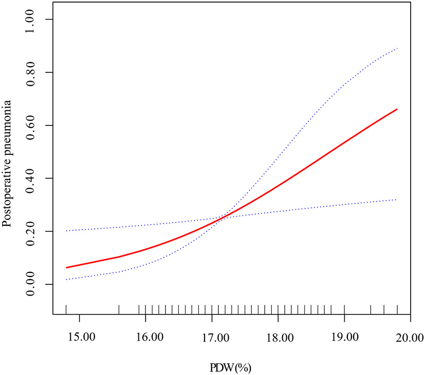 A total of 210 patients with AAAD were enrolled and the overall incidence of postoperative pneumonia was 25.24% (n = 53). Multivariate logistic regression revealed that PDW was positively associated with the risk of postoperative pneumonia (OR: 1.07, 95% CI: 1.02–1.13, P < 0.05) after adjusting the confounders. Compared with the lowest PDW tertile, the risk of postoperative pneumonia increased by 1.21-fold in the medium PDW tertile (OR: 2.21, 95% CI: 0.73–6.72) and by 3.16-fold in the highest PDW tertile (OR: 4.16, 95% CI: 1.40–12.33). A straight-line relationship was observed between PDW and postoperative pneumonia risk in smoothing spline fitting.