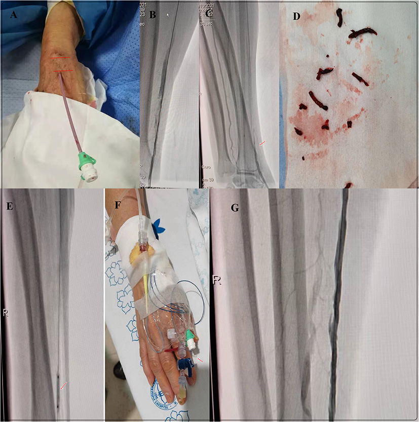 All the catheterization procedures were performed by a doctor who was experienced in the dTRA approach. The snuffbox access site was punctured by an intravenous catheter needle (1.02 mm). After successful puncture, an introducer sheath (Terumo Medical; Figure 1A) was inserted to a depth of ~1- to 2-cm. Radial angiography was performed to characterize the anatomy of the radial artery, the occluded end, thrombotic load, and the collaterals (Figures 1B,C). For acute occlusion or chronic occlusion with high thrombotic load, aspiration of the thrombus directly through the introducer sheath (7 French sheath is more suitable) or assisted by aspiration catheter was attempted (Figure 1D). If aspiration was unsuccessful or the radial artery angiography showed insufficient restoration after aspiration, balloon angioplasty was performed repeatedly with a 0.014 guidewire or a 0.025 guidewire assist if necessary (Figure 1E). Continuous thrombolytic therapy with urokinase via finecross microcatheter (Terumo, Japan) was given for 6–12 h after intervention surgery in patients with acute occlusion or chronic occlusion with high thrombotic load (Figure 1F). Finally, a satisfactory result on the radial angiography was achieved (Figure 1G).