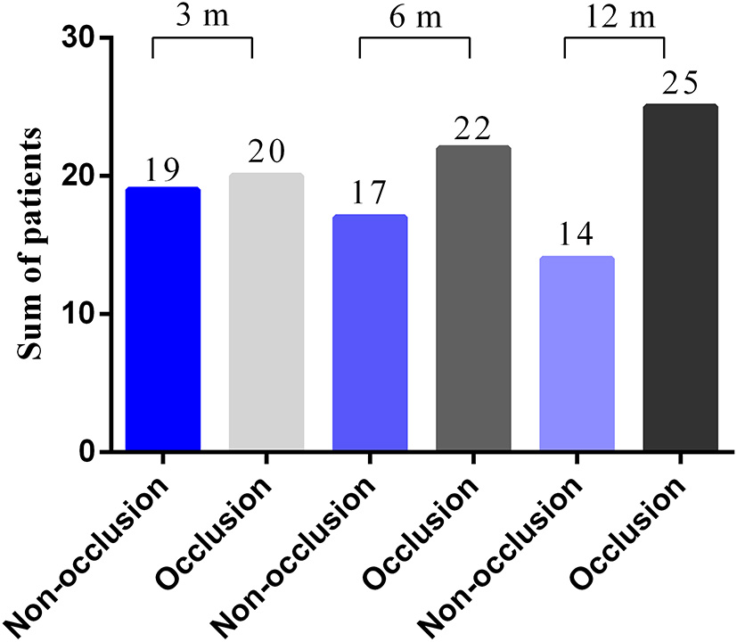 Restoration of the blood flow of the radial artery was monitored by Doppler ultrasound once a month after discharge from the hospital. In the successful group, at the 3-, 6-, and 12-month follow-ups, the patency rates were 48.7, 43.6, and 35.9%, respectively (Figure 2).