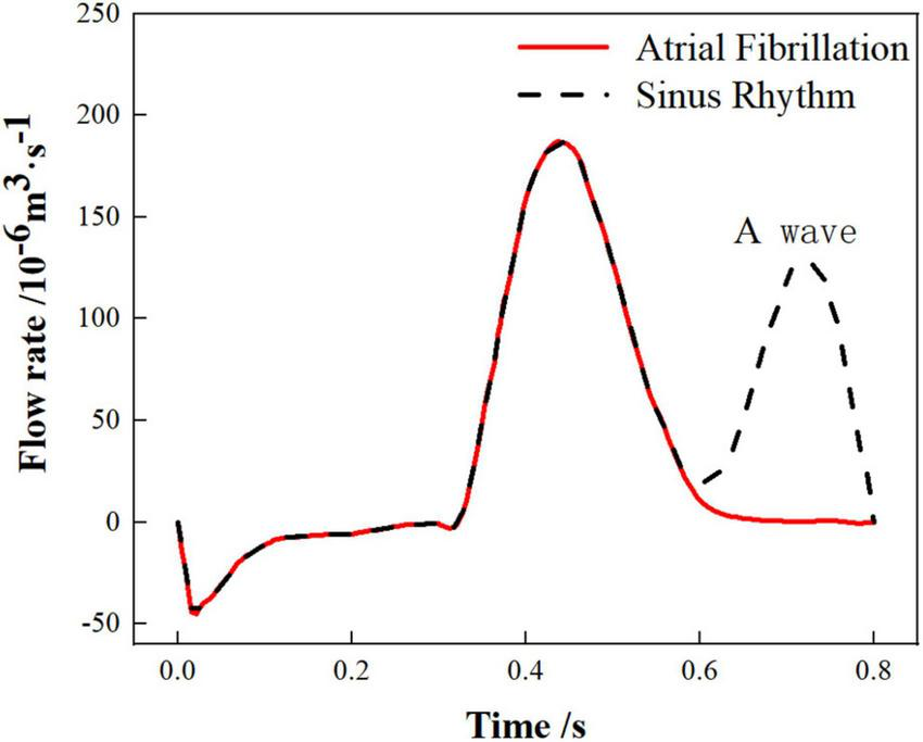 The work in this paper only considers the effect of chicken wing shape on internal flow of LAA and influence of thrombosis risk in AF. Therefore, the pulmonary vein inlets in the 6 cases were all set as an open boundary condition with a constant pressure of 0 Pa and the flow rate of the mitral valve outlet were also the same. The flow rate across the mitral valve in the sinus rhythm adopted in the simulation was based on international regulation ISO5840-1:2015 (39) and the flow rate curve of a period (0.8 s) was shown as the black dashed line in Figure 2. For the simulation of AF, the flow rate across the mitral valve was obtained by removing the second atrial emptying wave (A wave) from the healthy mitral blood flow (40), shown as red line in Figure 2.