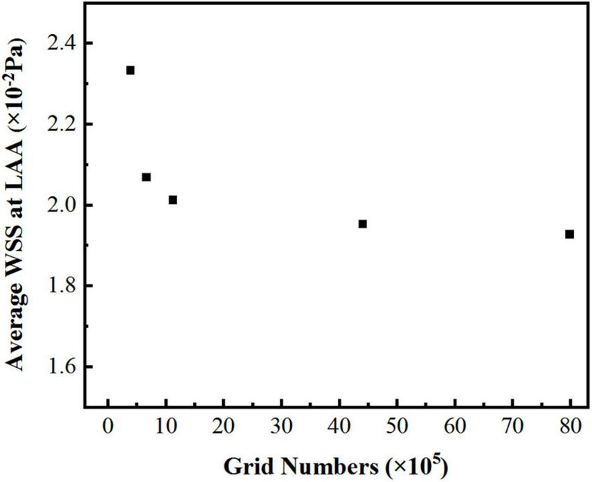 In the simulation, the reconstructed solid model was divided with tetrahedral unstructured mesh. For each model of LA, five sets of meshes with varying mesh counts were split, and the average wall shear stress (WSS) at LAA was used to validate gird-independence, Figure 3 shows the mesh-independent result of one of the models. The average WSS at LAA tends to decrease as the number of grids increases. When the number of grids increased to 1,124,416, the increasing amplitude of average WSS was very weak as the grids continued to grow. Therefore, based on the consideration of calculation accuracy and reasonable allocation of computing resources, the grid with the grid number 1,124,416 was chosen for the calculation. Other models were validated using the same grid-independence procedure, and the appropriate grid was chosen for the computation.