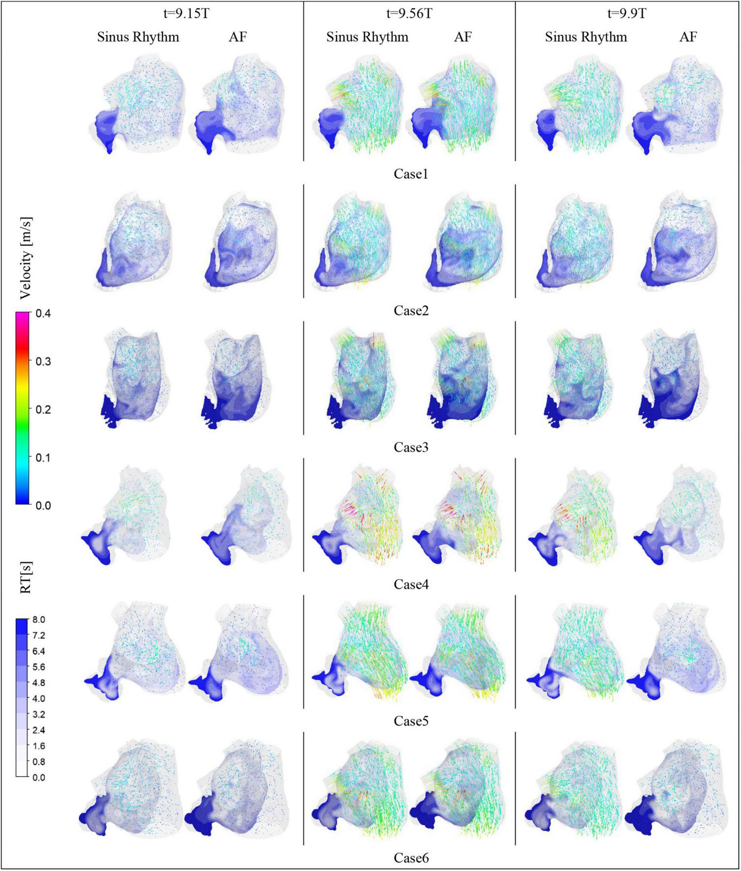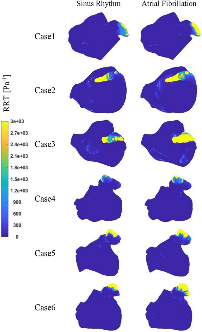 Figure 9 depicts the distribution of RRT at LA. Combined with Table 2, it is evident that there are significantly higher RT values at the LAA than at other parts of LA. The difference of RRT values are more than two orders of magnitude, which demonstrates that the risk of thrombus formation at the LAA is much greater than at other parts of LA. Furthermore, there is a significant increase in RRT values inner LA in AF state. Table 2 shows that the mean RRT values inside the LAA in Case 6 are greater in sinus rhythm than in AF. Compared with the maximum RRT value, it has greater maximum RRT values in sinus rhythm than the AF, but this can only represent a minor fraction. In terms of the extent of the thrombotic risk region, there is a larger risk of thrombosis in the AF. Due to the existence of atrial enlargement, the RRT values also reveal that cases 2 and 3 have a greater risk of thrombosis than the other instances.