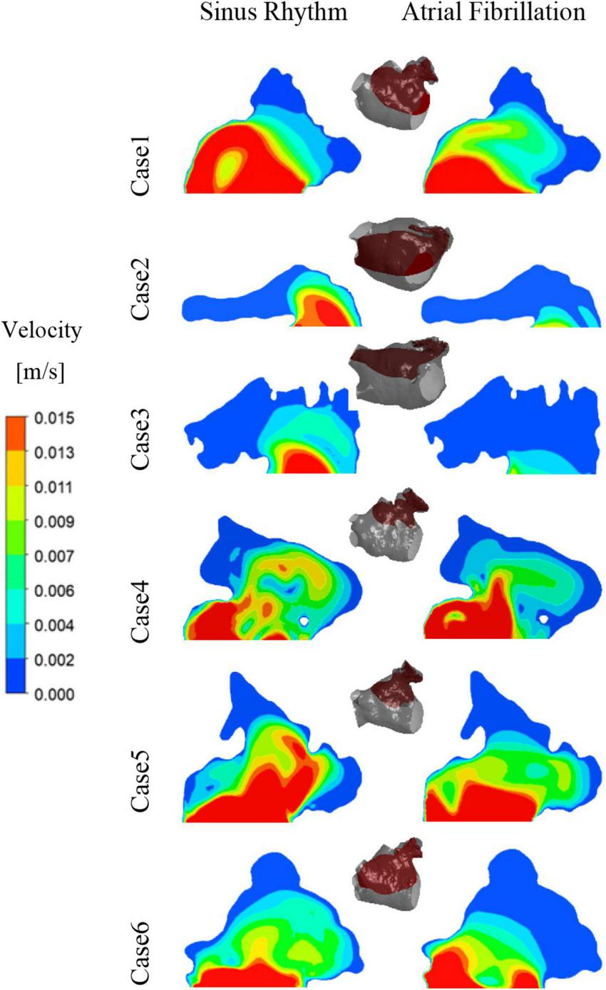Through the analysis of flow field in six cases of different LA, it is found that the blood flow velocity in LAA is significantly lower than that in other parts of LA, and the low velocity of blood flow leads to the increase of blood residence time and the risk of thrombosis. This result is in agreement with that in reference (47). In addition, when AF occurs, the internal blood flow velocity of LAA is further reduced, and the risk of thrombosis is further increased, which is consistent with previous studies (17) and clinical results.