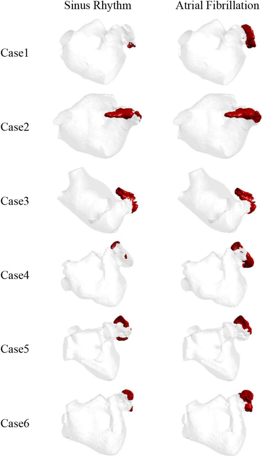 The thrombus formation is shown in Figure 6. All the thrombus formation appeared at the LAA, and the extent of thrombus formation is greatly increased in the AF state. Therefore, AF may increase the risk of blood clots. Among the results, there is a significant thrombus formation in the LAA in sinus heart rate, while scarcely in case 1 and case 4. Meanwhile, compared to other cases there exists a greater extent of thrombosis both in AF and sinus heart rate in case 2 and case 3, which might be closely related to the enlargement of LA (43).