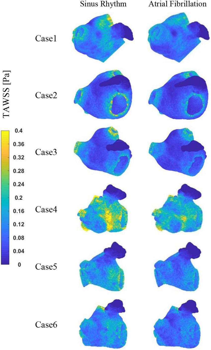 The TAWSS values at the LAA are less than 0.04 Pa in each case, as shown in Figure 7, which is much lower than the TAWSS values at other sites inside the LA. While, the TAWSS values are higher at the pulmonary vein and mitral valve openings due to the increased flow velocity. Besides, as show in Table 2, the LA has lower TAWSS values and a higher risk of thrombosis in the AF condition. Furthermore, case 4 has a higher TAWSS values than the other examples due to the higher flow velocity.