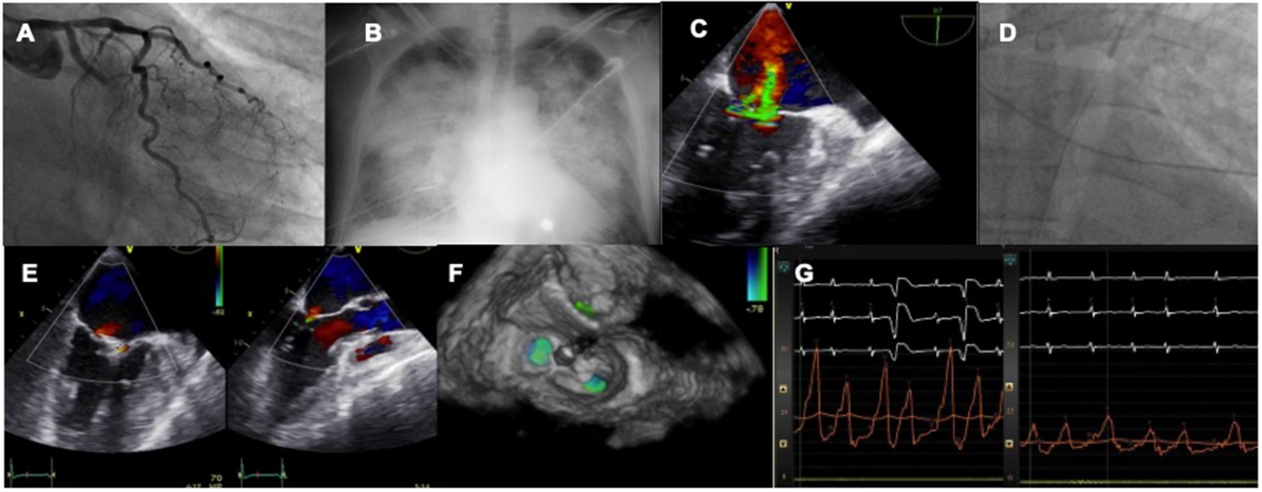 Case of acute MR after MI treated by TEER. A patient with LCX myocardial infarction (A) develops rapid pulmonary edema (B) and severe MR is diagnosed with echo (C). An IABP is inserted to stabilize the clinical condition (D). The valve is repaired with two MitraClip (E,F) leading to an acute drop in left atrial pressures (G).