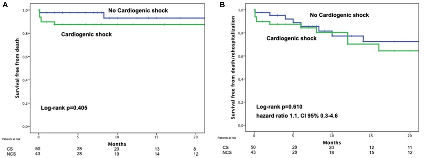 Comparison of survival free from death (A) or death and heart failure (B) of patients with postMI MR treated by TEER comparing those on cardiogenic shock with those who were not in cardiogenic shock. With permission from Haberman et al. (44).