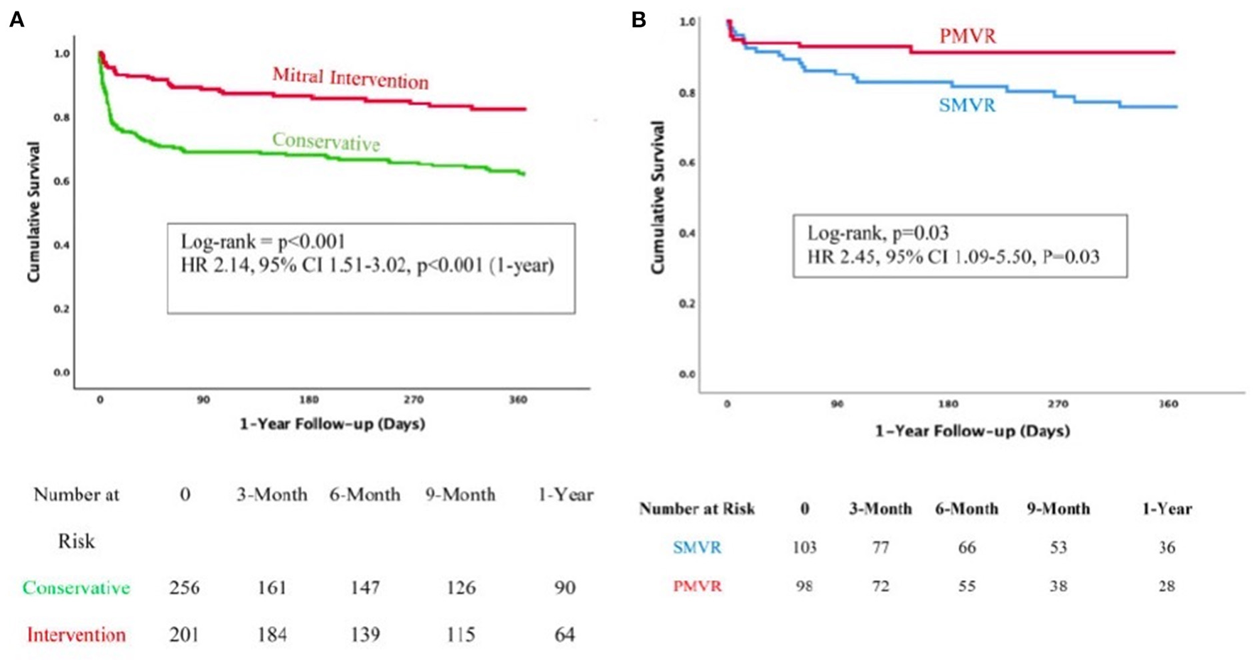 Comparison of patients with post MI MR under medical management vs. intervention (A) or surgery vs. TEER (B). With permission from Haberman et al. (9).
