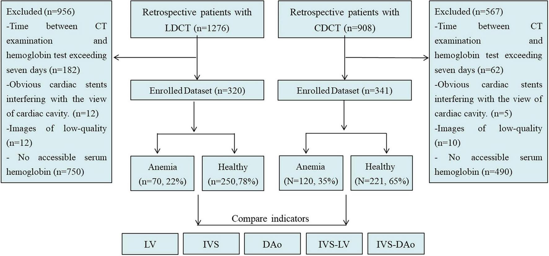 The Medical Ethics Committee of Tianjin Medical University Cancer Hospital approved this retrospective study (No. Bc2018039) with a waiver of informed consent. From January 2019 to March 2019, we enrolled 908 patients who underwent CDCT and 1,276 patients who underwent LDCT according to the inclusion criteria (Figure 1): 1. Patients who received thoracic CDCT or LDCT; 2. Accessible serum Hb level. A total of 567 patients who underwent CDCT and 956 patients who underwent LDCT were excluded according to the exclusion criteria (Figure 1): 1. The time between CT examination and hemoglobin test exceeding 7 days; 2. Images with obvious motion artifact; 3. Obvious cardiac stents interfering with the view of the cardiac cavity. Finally, 341 patients who underwent CDCT and 320 patients who underwent LDCT were enrolled in the study. One of the patients who underwent an LDCT scan had a CDCT examination after finding lung abnormalities.