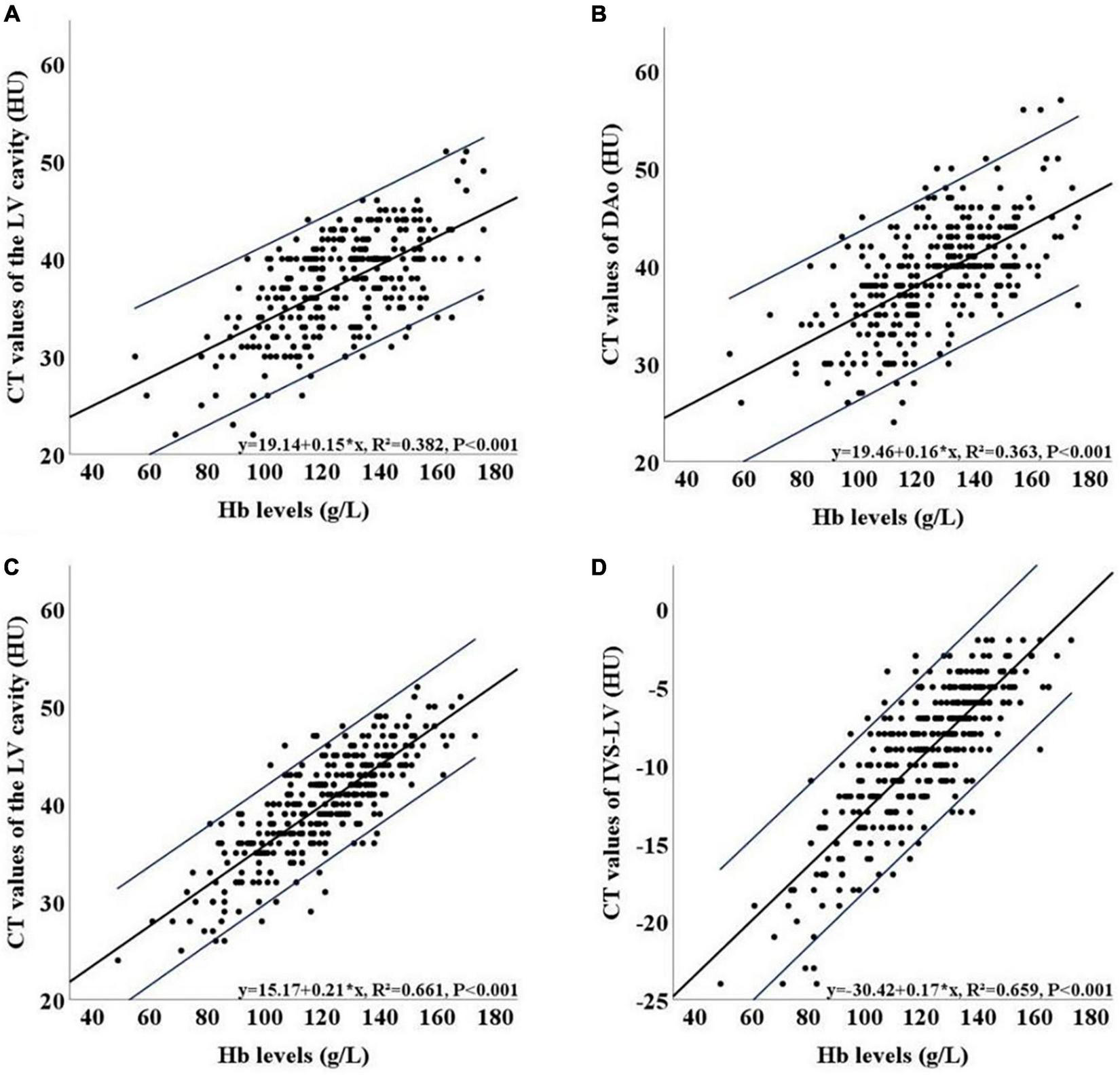 Correlation coefficients between all indicators and Hb levels are summarized in Tables 5, 6. In the LDCT group, the LV and DAo were more relevant with the Hb level (correlation coefficient: 0.618 and 0.602, respectively) than other indicators. The scatter plots indicated the relationship between Hb level and above two indicators with the linear regression formulas of y = 19.14 + 0.15x [95% CI: (16.52, 21.75) + (0.12, 0.17)x] and y = 19.46 + 0.16x [95% CI: (16.55, 22.36) + (0.13, 0.18)x] (Figures 3A,B), respectively. The correlation between IVS and Hb level (r = 0.332) was lower than that between blood pools and the Hb level. The IVS-LV and IVS-DAo showed a weak positive linear correlation with the Hb level (correlation coefficient 0.274 and 0.255, respectively). In the CDCT group, the LV and IVS-LV got higher correlation coefficients with Hb level (r = 0.813 and 0.812, respectively) than other indicators and showed an obvious linear distribution in the scatter plots (Figures 3C,D). According to the linear relationship, the linear regression formulas of two indicators with Hb level were y = 15.17 + 0.21x [95% CI: (13.24, 17.10) + (0.19, 0.22)x] and y = –30.42 + 0.17x [95% CI: (–32.06, –28.78) + (0.16, 0.19)x], respectively. The correlation coefficients of DAo and IVS-DAo with Hb level were 0.641 and 0.557, respectively. The IVS got the lowest correlation coefficient (r = 0.258). Except for the IVS, the correlation coefficients between the Hb level and all indicators in the CDCT group were higher than that in the LDCT group.