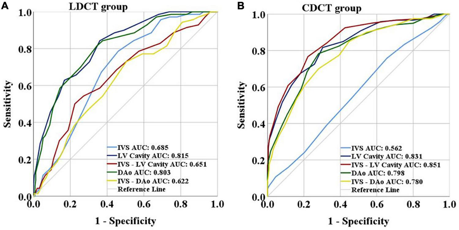 The results of the ROC curve are shown in Figures 4A,B. The best diagnostic indicators for anemia differed between the two groups. In the LDCT group, the LV and DAo had satisfactory performance in distinguishing anemia from non-anemia, with AUCs of 0.815 (95% CI: 0.763–0.868) and 0.803 (95% CI: 0.747–0.859), respectively. Youden’s index indicated that 37.5 HU and 38.5 HU were the best thresholds for the LV (sensitivity/specificity: 0.843/0.640) and DAo (sensitivity/specificity: 0.814/0.656), respectively. The negative predictive value and positive predictive value for the LV and DAo were 0.94/0.40 and 0.93/0.40, respectively. The AUCs of the IVS-LV, IVS-DAo and IVS were 0.651 (95% CI: 0.578–0.724), 0.622 (95% CI: 0.551–0.694), and 0.685 (95% CI: 0.622–0.747), respectively. DeLong test confirmed that there was no significant difference in AUC values between LV and DAo, and there was a significant statistical difference in AUC values of LV and DAo with IVS, IVS-LV, and IVS-DAo (P < 0.05, Table 7). The sensitivity and specificity of these indicators in diagnosing anemia under different thresholds were shown in Table 8. In the CDCT group, the LV and IVS-LV showed a favorable result in predicting anemia that produced AUCs of 0.831 (95% CI: 0.786–0.877) and 0.851 (95% CI: 0.808–0.894), respectively. The negative predictive value and positive predictive value for the LV and IVS-LV were 0.88/0.59 and 0.86/0.65, respectively. The AUCs of the DAo, IVS-DAo and IVS were 0.798 (95% CI: 0.748–0.847), 0.780 (95% CI: 0.729–0.831), and 0.562 (95% CI: 0.498–0.625), respectively. DeLong test confirmed that there was no significant difference in AUC values between IVS-LV and LV, but the difference in AUC values between IVS-LV and other indicators was statistically significant. There is no significant difference in AUC values of LV with DAo and IVS-DAo (Table 9). The optimal cutoffs for IVS-LV and LV were 9.5 HU (sensitivity/specificity: 0.767/0.778) and 40.5 HU (sensitivity/specificity: 0.817/0.697) (Table 10), respectively.