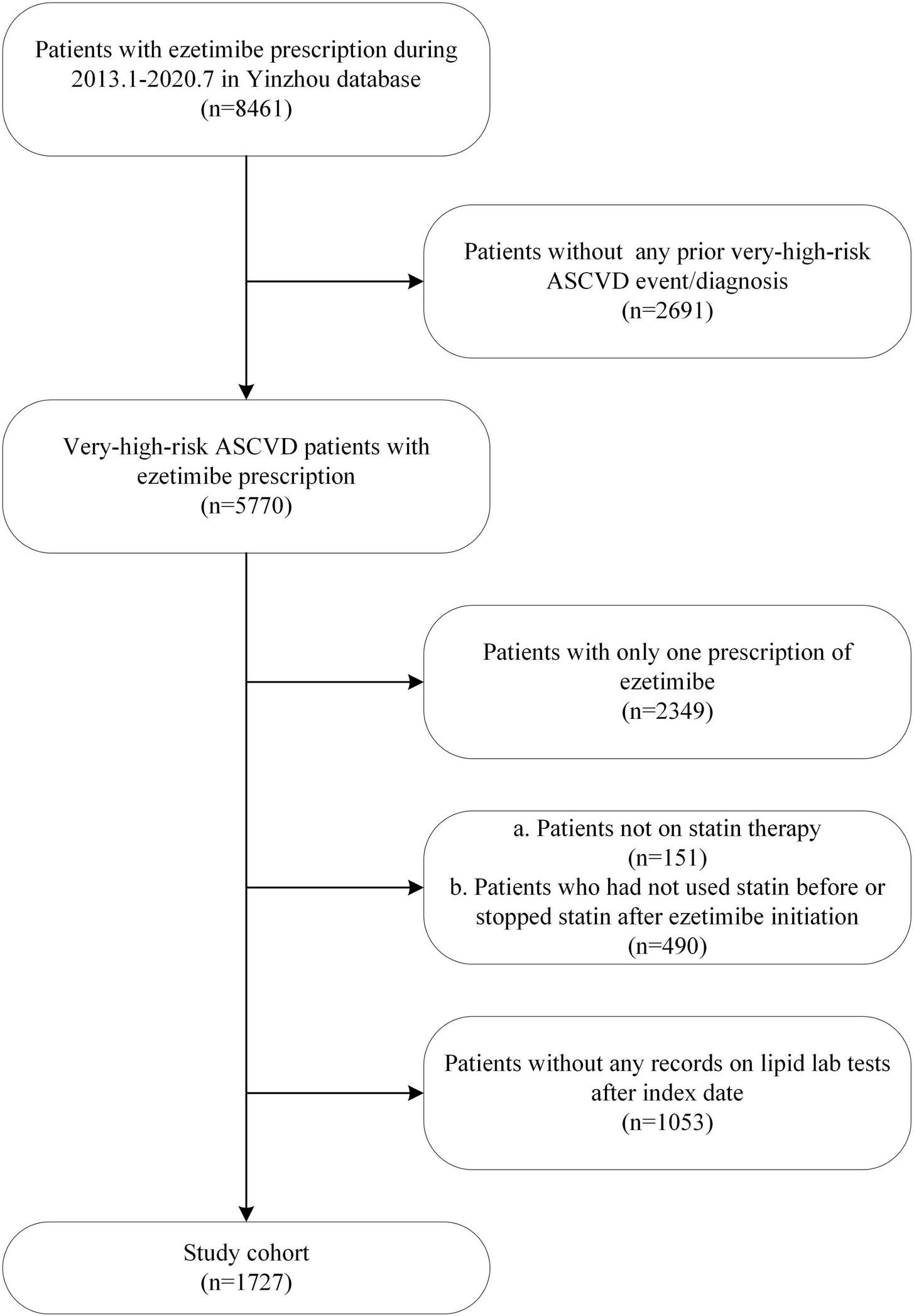 This was a population-based retrospective cohort study based on the regional health information system of Yinzhou. Eligible patients meeting all the following criteria between January 2013 and July 2020 were included in the study: (1) patients who had at least one documented very high-risk ASCVD event/diagnosis, including coronary heart disease, acute coronary syndrome, myocardial infarction, ischemic stroke, transient ischemic attack, and peripheral arterial disease (identified using diagnosis/intervention text combined with ICD-10 codes, detailed in Supplementary Table 1); (2) patients who had at least 2 separate prescriptions of ezetimibe and, at the same time, had at least 1 prescription of statin both before and after the initiation of ezetimibe; (3) patients who had at least one record of lipid test after ezetimibe initiation. The index date was the date of the first ezetimibe prescription. Patients were followed up until the last date of record collection, death or the end of the study period (01 July 2020), whichever was earlier.