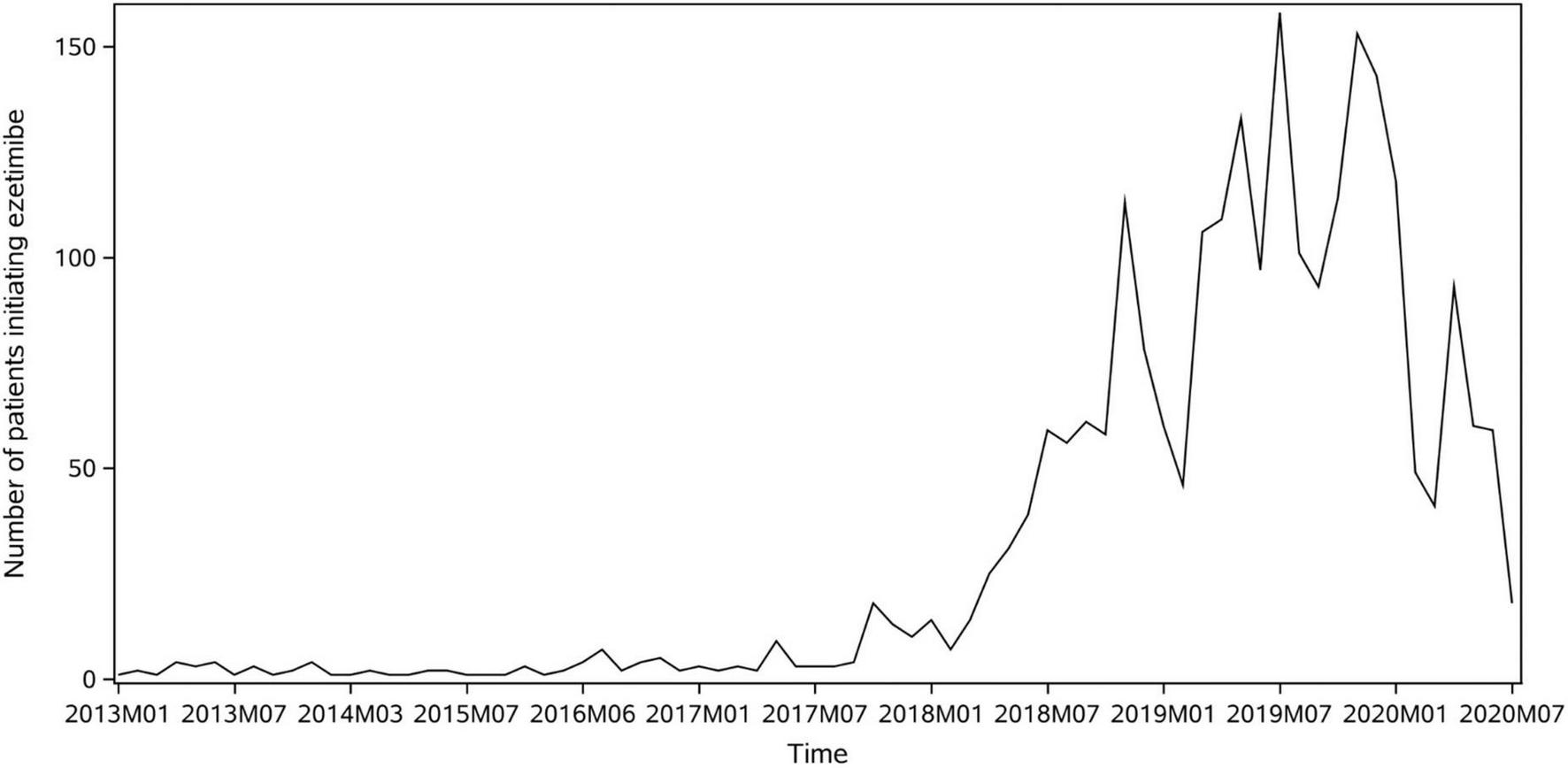 Number of patients starting to use ezetimibe over time in Yinzhou database.