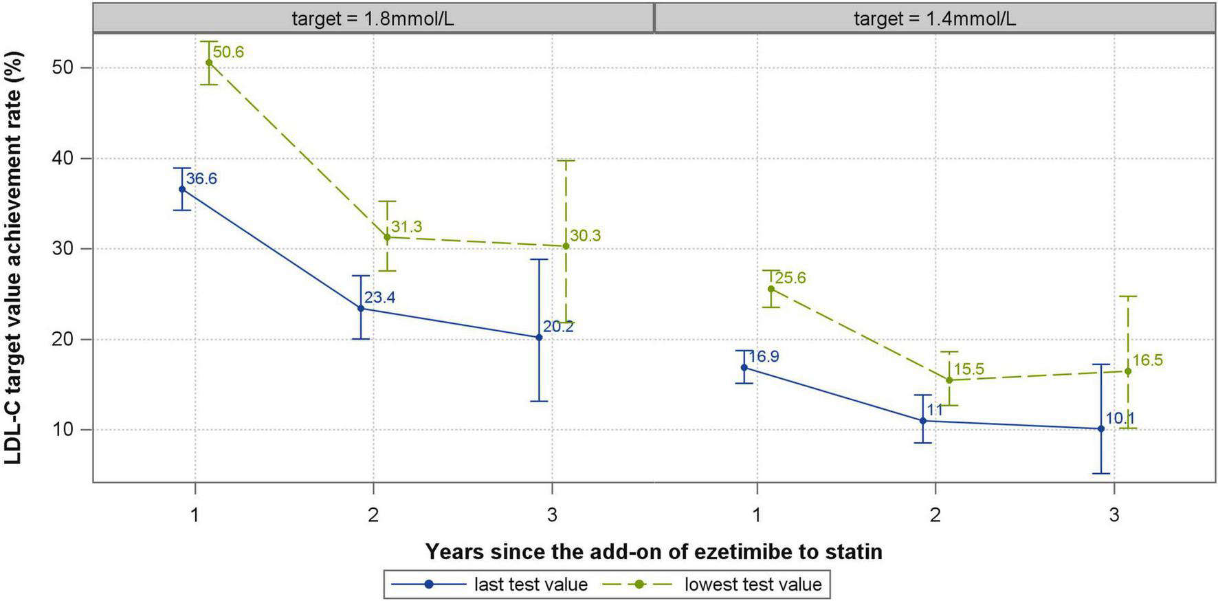 LDL-C target value achievement rate first 3 years after ezetimibe plus statin. The vertical lines and whiskers indicate the 95% confidence intervals of the relevant rates.