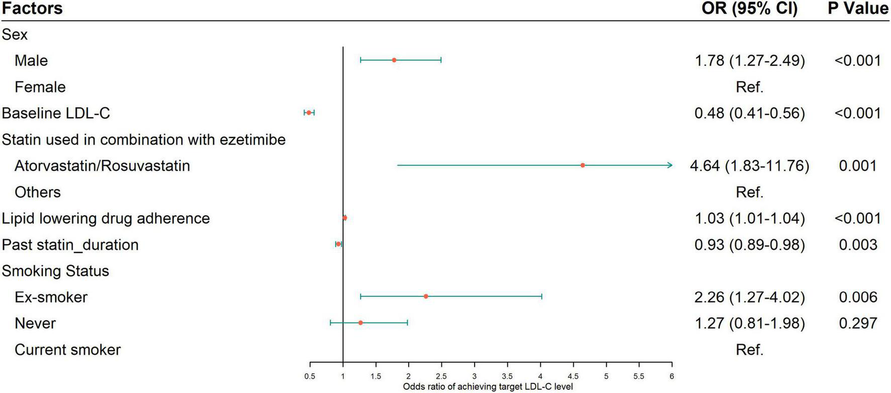 Multivariable logistic regression was used to explore the factors associated with LDL-C target achievement rate, and the results are presented in Figure 4. The data suggested that male patients (vs female, OR = 1.78, 95%CI: 1.27–2.49), combined use of either atorvastatin or rosuvastatin with ezetimibe (vs other statins, OR = 4.64, 95% CI: 1.83–11.76), better medication adherence (every incremental prescription of statin/ezetimibe per year, OR = 1.03, 95% CI: 1.01–1.04) and smoking cessation (vs smoking, OR = 2.26, 95% CI: 1.27–4.02) were associated with a higher achievement rate. Higher baseline LDL-C level (per mmol/L increase, OR = 0.48, 95% CI: 0.41–0.56), and longer treatment course of statin before ezetimibe (per year increase, OR = 0.93, 95% CI: 0.89–0.98) were associated with a lower achievement rate.