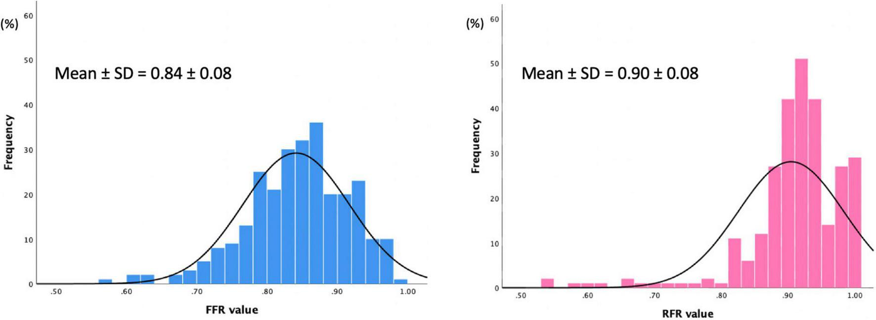 A total of 277 lesions from 235 patients were included in the analysis. The baseline characteristics of eligible patients are shown in Table 1. The mean age was 67.8 ± 10.5 years, 77.9% were male, 40.4% had diabetes, 54.5% presented with chronic coronary syndrome, and 40% had unstable angina. Coronary stenoses were mainly located in the left anterior descending artery (70.7%). The majority (56.6%) of lesions had diameter stenosis between 50 and 70% by visual assessment. The mean FFR and RFR values were 0.84 ± 0.08 and 0.90 ± 0.08, respectively (Table 2).