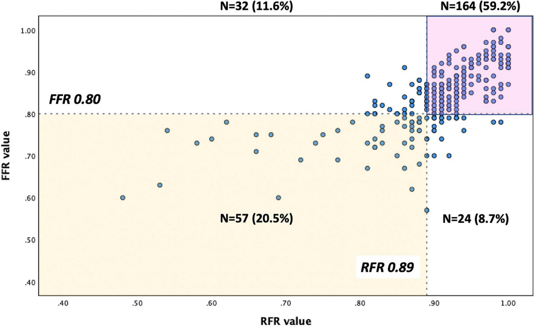 Nevertheless, the correlation between RFR and FFR on functional assessment has rarely been reported. Therefore, this study aimed to investigate the correlation between pressure wire-based FFR and RFR in the functional assessment of coronary stenoses in the real-world practice.