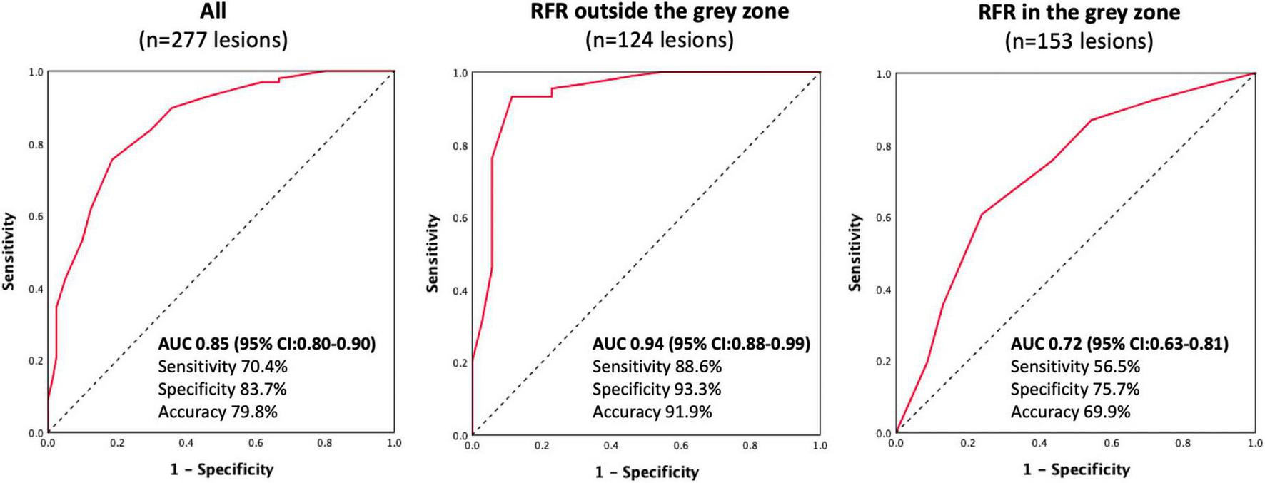The mean FFR and RFR values were 0.84 ± 0.08 and 0.90 ± 0.08, respectively. RFR significantly correlated with FFR (r = 0.727, P < 0.001). The agreement rate between the FFR and RFR was 79.8% (221/277). The diagnostic performance of RFR vs. FFR was accuracy 79.8%, sensitivity 70.4%, specificity 83.7%, positive predictive value 64.0%, and negative predictive value 87.2%. The discriminative power of RFR to identify lesions with FFR ≤ 0.80 was acceptable when the RFR value was within the gray zone [0.86 ≤ RFR ≤ 0.93; AUC: 0.72 (95% CI:0.63–0.81)], while it was excellent when the RFR value was out of the gray zone [RFR > 0.93 or < 0.86; AUC: 0.94 (95% CI:0.88–0.99)].