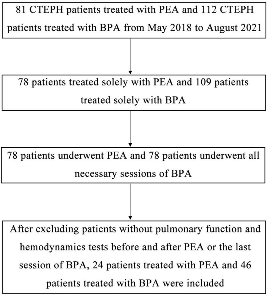 Schematic diagram of the screening process to include or exclude cases. After searching the electronic medical record using ICD-9-CM3, we found 89 patients receiving PEA and 166 patients receiving BPA from May 2018 to August 2021 in our center. After excluding patients without CTEPH, patients receiving both PEA and BPA, patients who have not received all sessions of BPA, and patients without available pulmonary function test before and after intervention, we finally enrolled 24 patients treated with PEA and 46 patients treated with BPA.
