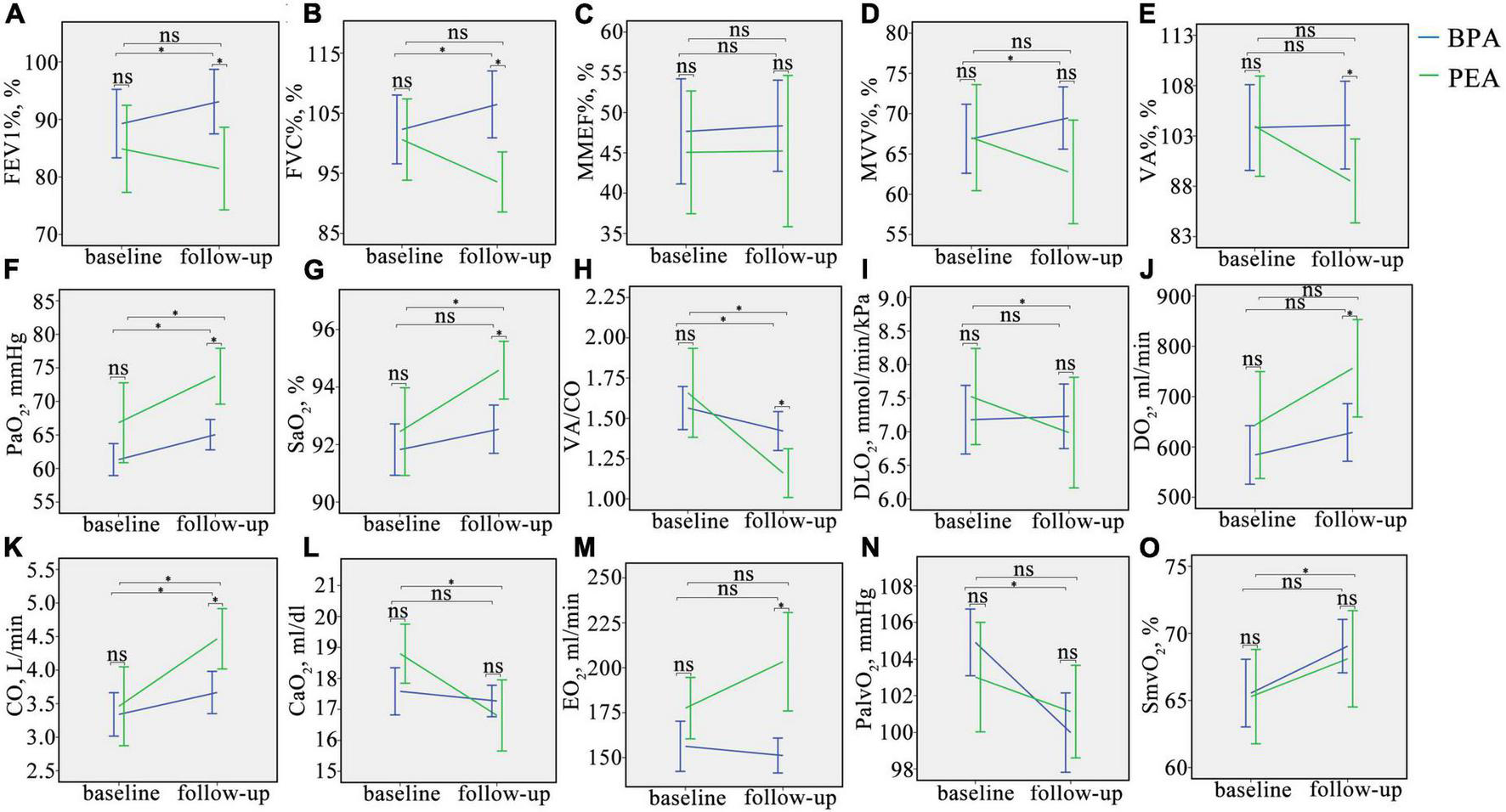 The change in the percentage of the predicted forced expiratory volume in the 1 s (−3.4 ± 12.7 vs. 3.8 ± 8.7%, P = 0.006) and forced vital capacity (−5.5 ± 13.0 vs. 4.2 ± 9.9%, P = 0.001) among the PEA group (n = 24) and BPA group (n = 46) were significantly different. Patients in the PEA group had a significant increase in their arterial oxygen saturation (from 92.5 ± 3.6 to 94.6 ± 2.4%, P = 0.022), while those in the BPA group had no change, which could be explained by a significant improvement in ventilation/perfusion (−0.48 ± 0.53 vs. −0.17 ± 0.41, P = 0.016). Compared with patients post-BPA, patients post-PEA were characterized by higher oxygen delivery (756.3 ± 229.1 vs. 628.8 ± 188.5 ml/min, P = 0.016) and higher oxygen extraction (203.3 ± 64.8 vs. 151.2 ± 31.9 ml/min, P = 0.001).