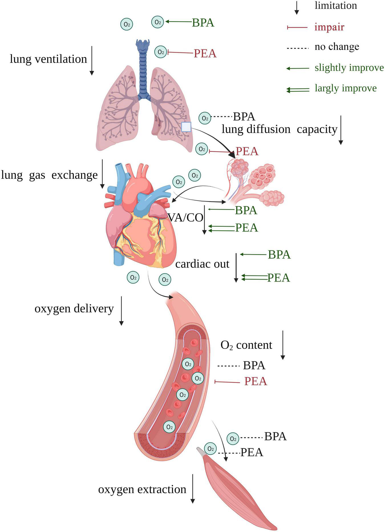The oxygen pathway includes multiple complex steps including uptake in the lungs, transportation from alveoli to blood, carrying capacity of the blood, delivery from center to the periphery, extraction of peripheral tissue, and cellular use (6). Impairments in the oxygen pathway can occur in various diseases including heart failure, leukemia, tumors, connective tissue diseases, and respiratory diseases, leading to hypoxia and death (7–12). In patients with CTEPH, occlusion of the pulmonary artery can reduce lung perfusion, causing mismatched ventilation/perfusion and an abnormality in lung function, particularly a decreased lung diffusion capacity (13, 14). Moreover, a recent seminal study found that in addition to the pulmonary gas exchange, multiple steps of the oxygen pathway were defective in patients with CTEPH, including oxygen extraction by peripheral tissues, and pulmonary vascular interventions could partly correct the impaired oxygen pathway (15), in which only 10 patients had available data on the oxygen pathway after intervention. Despite the improved outcomes of CTEPH patients treated with PEA and BPA, the effects of these two interventions on the oxygen pathway are not well demonstrated and have not yet been compared. To better understand the pathophysiological mechanism and to compare the effects of PEA and BPA on the oxygen pathway, we retrospectively collected data, including pulmonary function test, hemodynamics, and blood gas analysis, from CTEPH patients before and after the interventions (PEA or BPA), and different responses of the oxygen pathway in patients treated with PEA versus BPA were revealed.