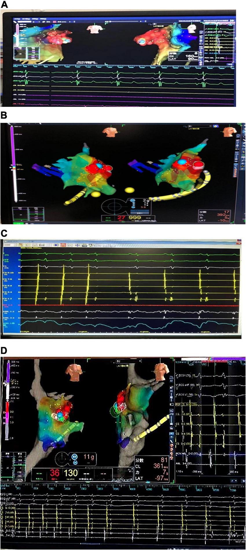In this study, three cases of AT originating from the AA were included, with a history of 3 days to 2 years of persistent AT that failed to respond to antiarrhythmic drugs. Echocardiography showed an enlarged heart with LVEDDs of 40, 45.8, and 45 mm, and LVEFs of 42, 29, and 45%, respectively (Table 1).