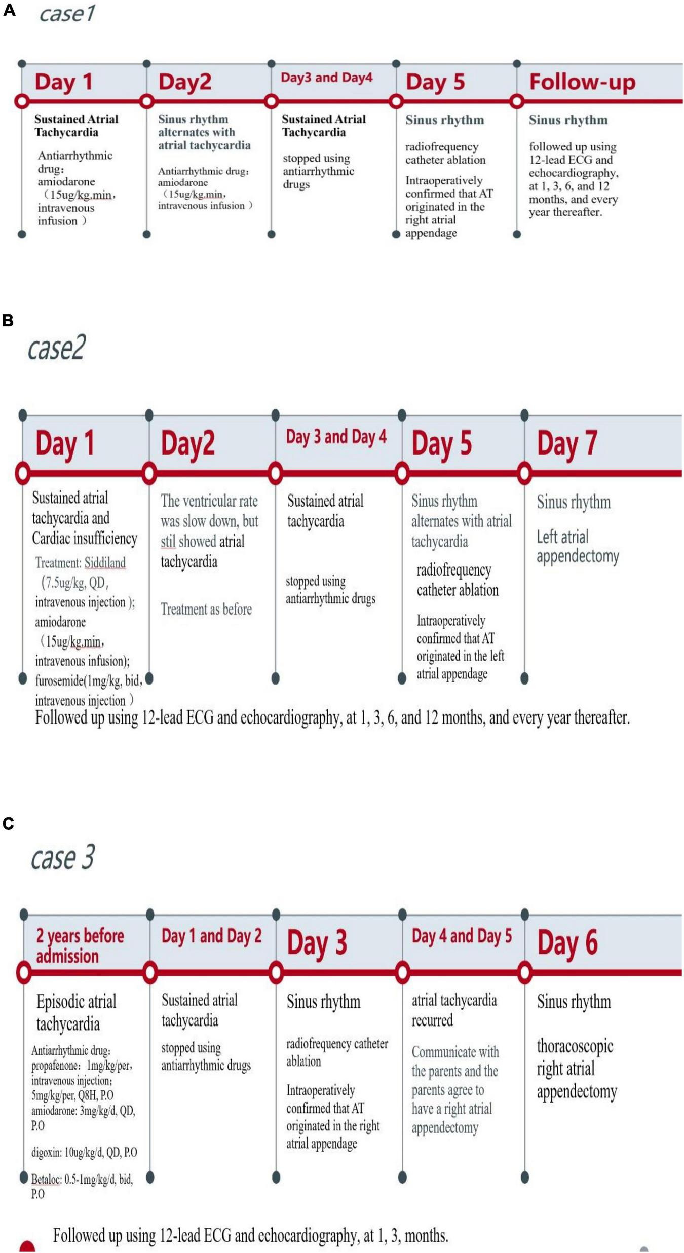 In our three cases, AT lasted from 3 days to 2 years, and each case resulted in TIC, which was characterized by increased LVEDD and decreased LVEF. Each of the three patients was treated with several antiarrhythmic drugs before undergoing RFCA, but no therapeutic effects were observed. After RFCA and AA resection, the ECGs showed recovery of sinus rhythm, and LVEDD and LVEF gradually recovered in each patient. These findings showed that cardiomyopathy caused by tachycardia was reversible. Studies have shown that the median duration required for LVEF to return to normal in children with TIC caused by AT was 1.5 months, while reverse ventricular remodeling required several months to years to complete (23, 24). In this report, two cases returned to normal LVEDD and LVEF at 1-year follow-up, and one case improved on the second day after surgery. However, long-term data were not available due to the short follow-up period. Additional follow-up appointments will be scheduled to monitor these patients.